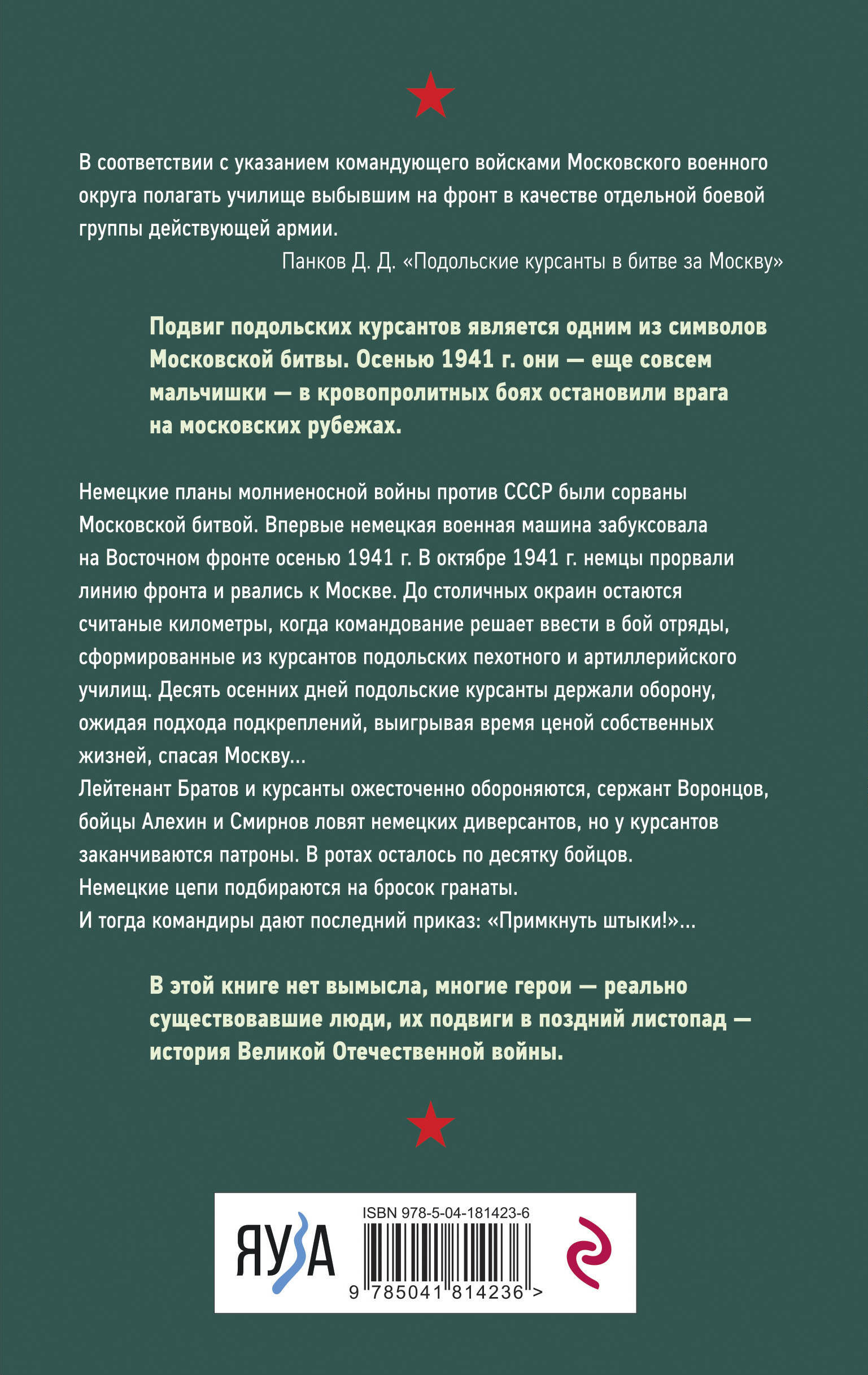Подвиг подольских курсантов является одним из символов сражения за Москву. Осенью 1941 года они - еще совсем мальчишки - в кровопролитных боях остановили врага на московских рубежах. Немецкие планы молниеносной войны против СССР были сорваны Московской битвой. Впервые немецкая военная машина забуксовала на Восточном фронте осенью 1941 г. В октябре 1941 г. немцы прорвали линию фронта и рвались к Москве. До столичных окраин остаются считанные километры, когда командование решило ввести в бой отряды, сформированные из курсантов Подольских пехотного и артиллерийского училищ. Десять осенних дней подольские курсанты держали оборону, ожидая подхода подкреплений, выигрывая время ценой собственных жизней, спасая Москву... Лейтенант Братов и курсанты ожесточенно обороняются, сержант Воронцов, бойцы Алехин и Смирнов ловят немецких диверсантов, но у курсантов заканчиваются патроны. В ротах осталось по десятку бойцов. Немецкие цепи подбираются на бросок гранаты. И тогда командиры дают последний приказ: «Примкнуть штыки!»... В этой книге нет вымысла, многие герои - реально существовавшие люди, их подвиги в поздний листопад - история Великой Отечественной войны.| Издательство | ООО "Издательство "Эксмо" |
