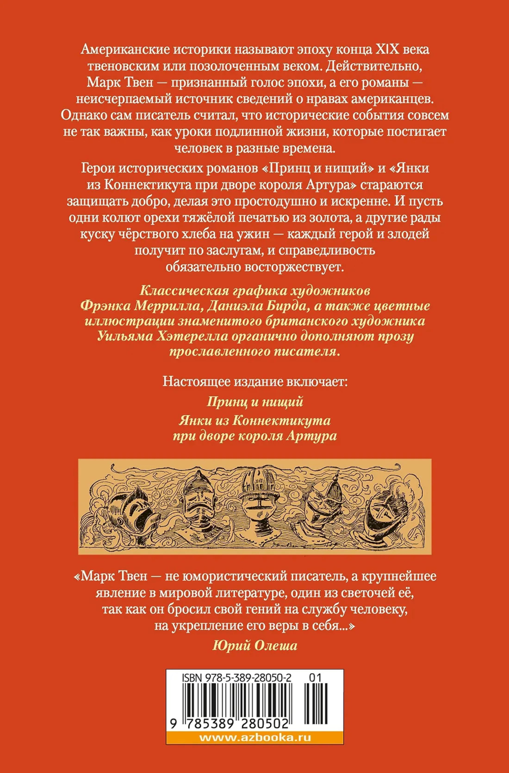 В знаменитых исторических романах Марка Твена герои попадают в немыслимые ситуации и должны приспосабливаться к совершенно неожиданным обстоятельствам. Нелюбимый оборвыш Том Кенти из беднейшего района Лондона XVI века и желанный наследник британской короны Эдуард Тюдор меняются местами, а простой американец Хэнк Морган из Восточного Хартфолда, штат Коннектикут, однажды просыпается не в своём родном городе и даже не в XIX веке, а в Британии в 528 году, в эпохе короля Артура и рыцарей Круглого стола. Но если описанные события случаются только в сказках, то дух времени и стран, где живут герои, воссозданы автором, одним из родоначальников американской литературы, со скрупулёзной достоверностью. Открывая книги Марка Твена, читатели погрузятся в «совершенно особый, увлекательный и яркий мир, где порою дуют очень холодные ветры, но не гаснет огонёк настоящей человечности». Классическая графика художников Фрэнка Меррилла, Даниэла Бирда, а также цветные иллюстрации знаменитого британского художника Уильяма Хэтерелла органично дополняют прозу прославленного писателя.| Издательство | Азбука |