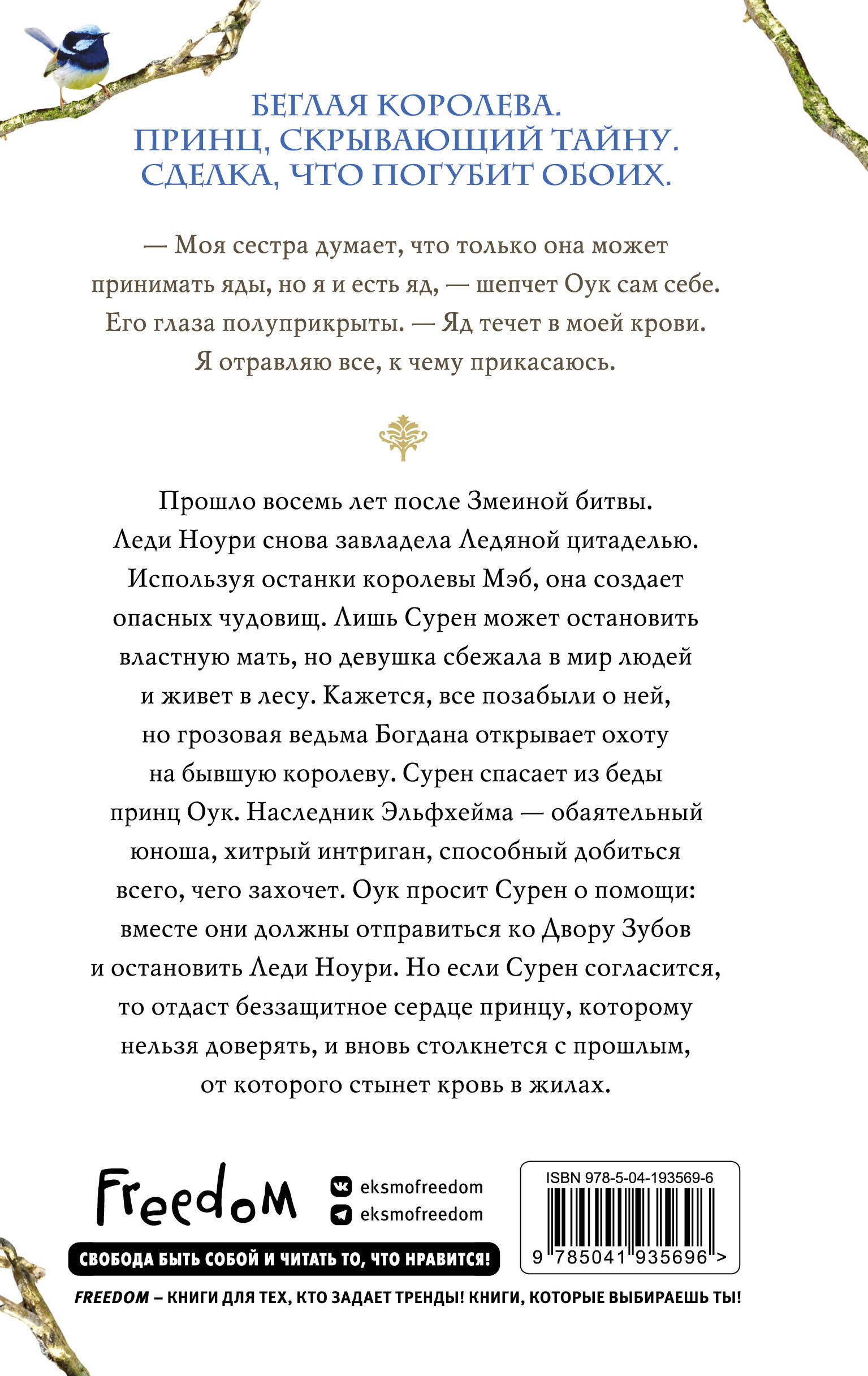 Спин-офф культовой фэнтези-трилогии Холли Блэк о Фейриленде «Воздушный народ»! Действие происходит в той же Вселенной, теперь в игру вступают наследники - принц Оук и королева Сурен. Вместе им предстоит бороться со злом в любимом Эльфхейме, защищая сердца друг от друга, ведь у каждого из них свои тайны и секреты. Сурен и Оук познакомились в ночь, когда Мадок, леди Ноури и лорд Джарел пытались договориться о свадьбе маленьких детей. Оуку тогда было около девяти, а Сурен - десять. Теперь они выросли, и начинается их собственная история. Сурен выяснит, что принц уже вовсе не тот милый мальчик, которому она доверяла, и теперь он сеет смерть и хаос. Неповторимое фэнтези, наполненное интригами, предательствами и опасными желаниями - ведь речь идет о Фейриленде, мире коварных и смертоносных фейри!