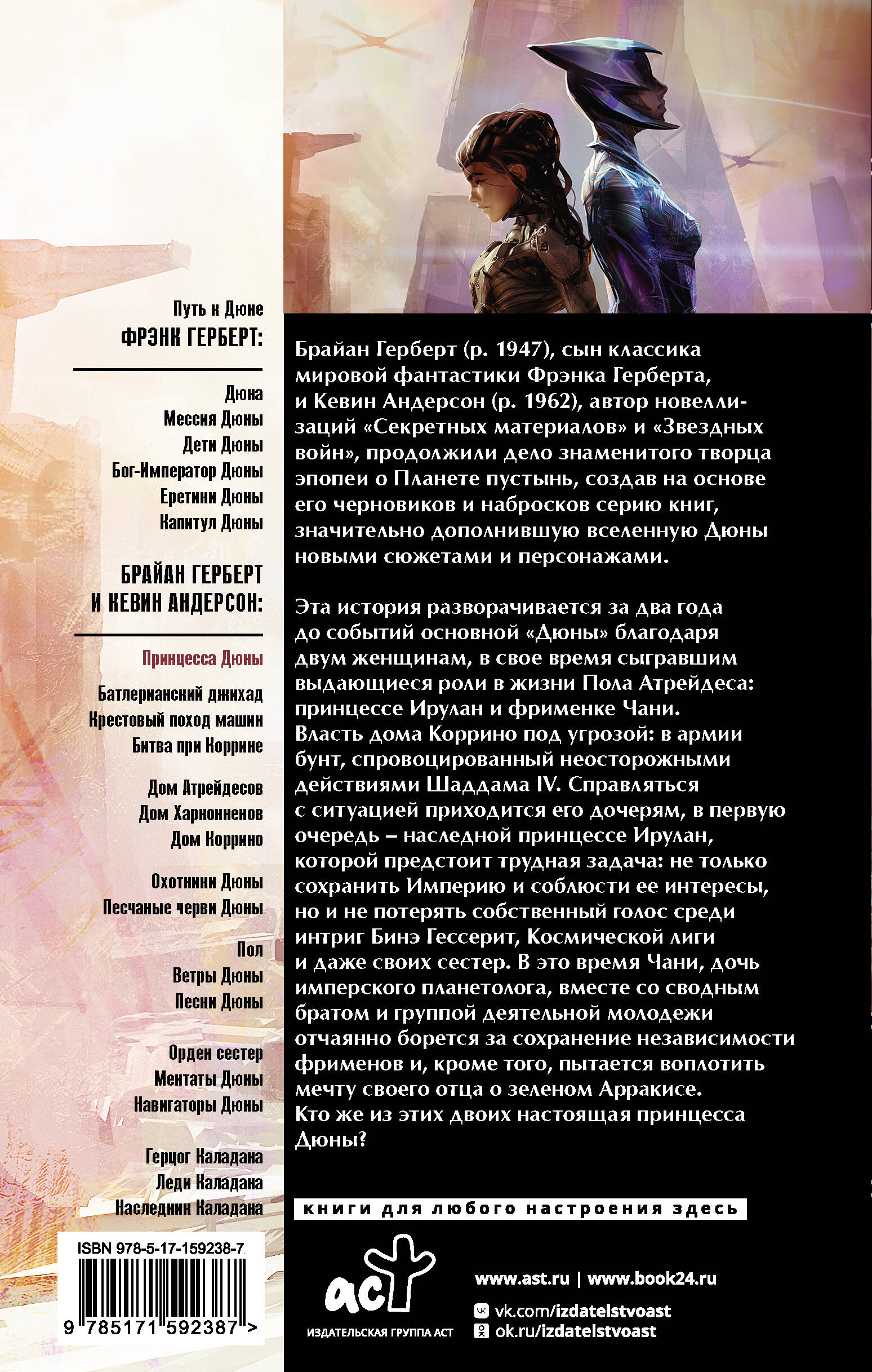 Эта история разворачивается за два года до событий основной "Дюны" благодаря двум женщинам, в свое время сыгравшим выдающиеся роли в жизни Пола Атрейдеса: принцессе Ирулан и фрименке Чани. Власть дома Коррино под угрозой: в армии бунт, спровоцированный неосторожными действиями Шаддама IV. Справляться с ситуацией приходится его дочерям, в первую очередь - наследной принцессе Ирулан, которой предстоит трудная задача: не только сохранить Империю и соблюсти ее интересы, но и не потерять собственный голос среди интриг Бинэ Гессерит, Космической лиги и даже собственных сестер. В это время Чани, дочь имперского планетолога, вместе со сводным братом и группой деятельной молодежи отчаянно борется за сохранение независимости фрименов и кроме того пытается воплотить мечту своего отца о зеленом Арракисе. Кто же из этих двоих настоящая принцесса Дюны?| Издательство | Издательство "АСТ" |