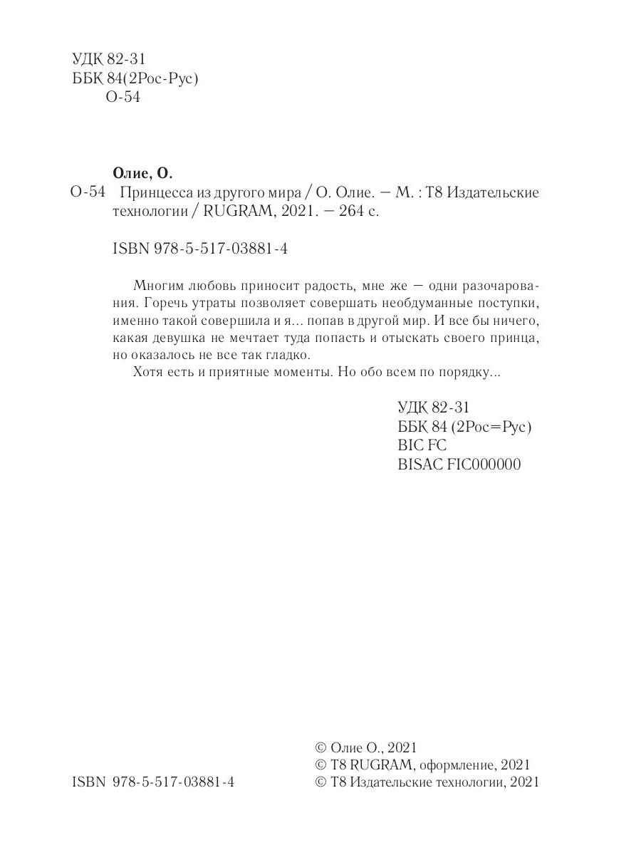"Многим любовь приносит радость, мне же - одни разочарования. Горечь утраты позволяет совершать необдуманные поступки, именно такой совершила и я... попав в другой мир. И все бы ничего, какая девушка не мечтает туда попасть и отыскать своего принца, но оказалось не все так гладко. Хотя есть и приятные моменты. Но обо всем по порядку..."| Издательство | Т8 RUGRAM |