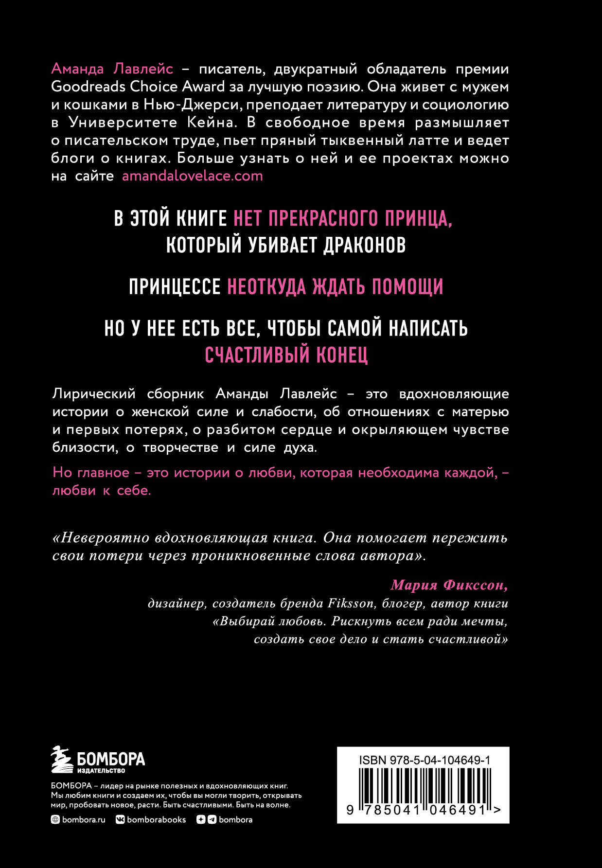 Что делать, если принц превратился в дракона и заточил тебя в башню? В этой книге, как и в жизни, у принцессы есть все, чтобы спастись и самой написать счастливый конец. Лирический сборник Аманды Лавлейс - это вдохновляющие истории о женской силе и слабости, об отношениях с матерью и первых потерях, о разбитом сердце и окрыляющем чувстве близости, о творчестве и силе духа. Но главное - это истории о любви, которая необходима каждой - любви к себе.