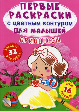 Аннотация: Принцессы. Первые раскраски с цветным контуром для малышей (16 ярких рисунков, 32 большие наклейки)