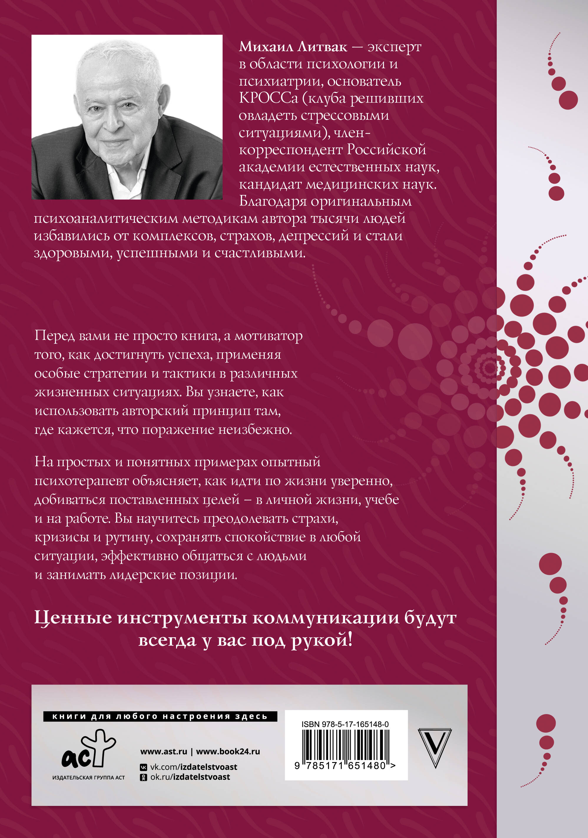 Михаил Литвак - эксперт в области психологии и психиатрии, основатель КРОССа (клуба решивших овладеть стрессовыми ситуациями), член-корреспондент Российской академии естественных наук, кандидат медицинских наук. Благодаря оригинальным психоаналитическим методикам автора тысячи людей избавились от комплексов, страхов, депрессий и стали здоровыми, успешными и счастливыми. Перед вами не просто книга, а мотиватор того, как достигнуть успеха, применяя особые стратегии и тактики в различных жизненных ситуациях. Вы узнаете, как использовать авторский принцип там, где кажется, что поражение неизбежно. На простых и понятных примерах опытный психотерапевт объясняет, как идти по жизни уверенно, добиваться поставленных целей - в личной жизни, учебе и на работе. Вы научитесь преодолевать страхи, кризисы и рутину, сохранять спокойствие в любой ситуации, эффективно общаться с людьми и занимать лидерские позиции. Ценные инструменты коммуникации будут всегда у вас под рукой!| Издательство | Издательство "АСТ" |