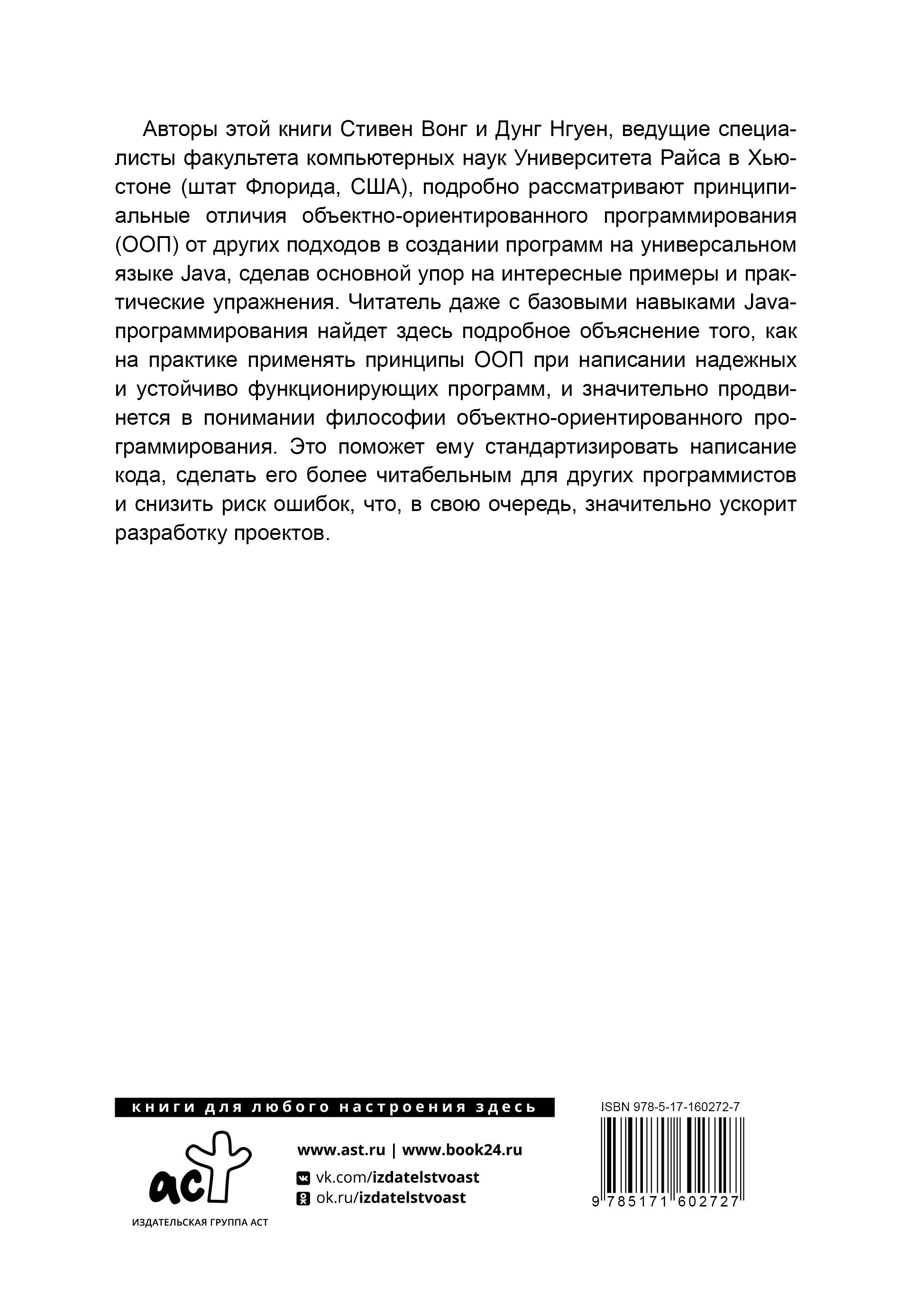 В данном издании подробно рассматриваются самые важные вопросы, связанные с объектно-ориентированным программированием (ООП), которое предполагает подход к созданию кода как к моделированию информационных объектов. На более высоком абстрактном уровне основная задача ООП - структурирование информации с точки зрения управляемости, что позволяет успешно реализовывать крупные программные проекты. В этой книге пристальное внимание уделяется таким концепциям методологии объектно-ориентированного программирования как абстракция, инкапсуляция, наследование и полиморфизм. Освоив неизменно эффективные принципы ООП, начинающие и опытные программисты получат в свое распоряжение отлично структурированный способ управления сложным кодом, а также смогут более продуктивно использовать и поддерживать его.