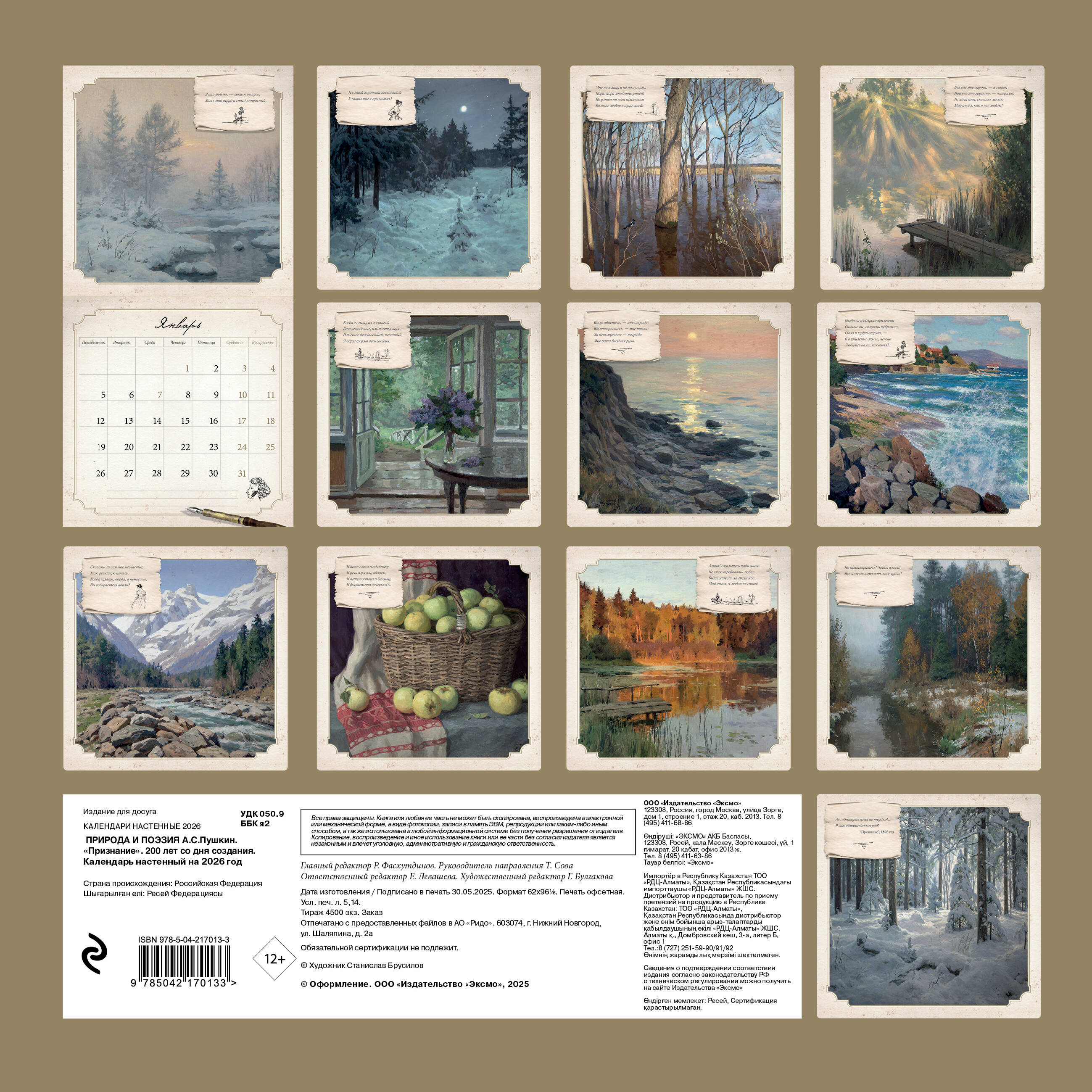 Наши настенные календари отличаются высоким качеством исполнения! Тщательно подобранные иллюстрации, напечатанные на глянцевой бумаге высочайшего качества, станут настоящим украшением дома, а в календарной сетке найдется место для ваших планов: большие клетки позволят делать записи и организовать свой год! В календаре также отмечены все государственные праздники. В серии настенных календарей издательства «ЭКСМО» каждый найдет тему по вкусу: великие художники, великолепные подборки с самыми знаменитыми произведениями искусства, легендарные кинематографические саги и игры, главные книжные авторы и бестселлеры, фотографии и иллюстрации любимых животных и многое-многое другое! О календаре: Планируйте дела, вдохновляясь вечными строками А.С. Пушкина и иллюстрациями современного художника С. Брусилова, не забывая о праздничных и выходных днях, которые отмечены в календаре! Каждый месяц - новая строфа русского поэта, новая картина, соответствующая времени года и настроению, удобная календарная сетка и хорошее настроение! Для кого: Большой настенный календарь с прекрасными картинами современного художника Станислава Брусилова и волшебными строками А.С. Пушкина украсит любой интерьер и станет прекрасным подарком для всех поклонников его поэзии! Технические параметры: - Тип календаря - настенный перекидной. - Год - 2026. - Календарная сетка - с разбивкой по месяцам. - Вид скрепления - скрепка. - Внутренний блок - мелованная бумага 115 г/м2. - Подложка - плотный гофрокартон для поддержания формы. - Индивидуальная упаковка в плотный целлофановый пакет.| Издательство | ООО "Издательство "Эксмо" |
