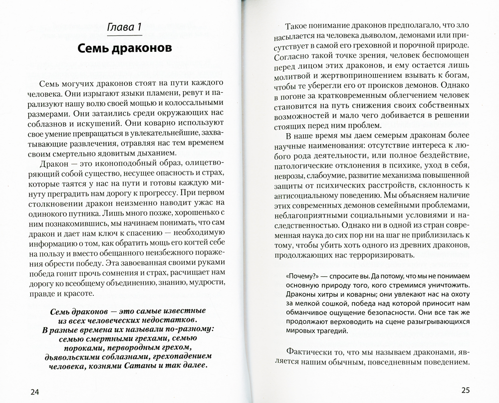Более 20 лет книга Хосе Стивенса «Приручи своих драконов» остается бестселлером и меняет жизни многих людей. В чем же секрет ее успеха? Еще в начале своей карьеры психотерапевта автор обнаружил, что в современной психологии не хватает какого-то важного элемента. Он стал искать его в трудах древних мыслителей, мифах и сказках и смог ухватиться за ниточку познания, протянувшуюся к нам сквозь века, а потом и вплести ее в клубок современных идей. Так родилась методика, позволяющая выявлять глубинные проблемы и убирать барьеры, стоящие на пути большинства людей. Главные герои этой книги - семь драконов, представляющие собой семь основанных на страхе поведенческих реакций человека. Стивенс построил их парами: дракон высокомерия стоит рядом с драконом самоуничижения, дракон нетерпеливости - с драконом мученичества, дракон жадности - с драконом саморазрушения, а последний, седьмой - дракон упрямства, - способен поладить с каждым из шести предыдущих. Все эти чудовища уже много веков держат человечество в своих лапах, мешая людям жить полноценной жизнью. Они хитры и коварны и хорошо прячутся у нас в душе, чтобы творить свои темные дела исподтишка и не дать себя обнаружить. Однако Хосе Стивенс знает, как их найти и обезвредить. В этой книге он дает оружие, благодаря которому вы сможете приручить своих драконов и использовать силу этих мистических существ.| Издательство | Питер |