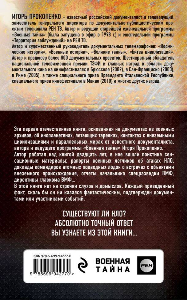 Об авторе Игорь Прокопенко - известный документалист, журналист, телеведущий, авторству которого принадлежат самые популярные и рейтинговые программы на отечественном телевидении «Военная тайна», «Самые шокирующие гипотезы» и «Теория заблуждений» (РЕН ТВ). Совокупный тираж проданных книг автора составляет более 500 000 экземпляров. Жанр Научно-популярная литература. О книге Книга «Пришельцы государственной важности» серии «Военная тайна с Игорем Прокопенко» поднимает вопросы: Существует ли НЛО на самом деле? Какие контакты с пришельцами были зафиксированы на государственном уровне? Какую роль, сами того не подозревая, сыграли инопланетяне в «холодной войне»? Это первая книга, в которой автор основывается только на документах и реально подтвержденных случаях встреч с внеземными цивилизациями, хранящихся в военных архивах, и впервые рассказывает, почему эта информация так тщательно скрывается. Особенности Только факты и ничего, кроме фактов. Здесь нет ни строчки домыслов и слухов, а только исследования военных и ученых, свидетельства очевидцев и официальные материалы журналистских расследований.| Издательство | ООО "Издательство "Эксмо" |