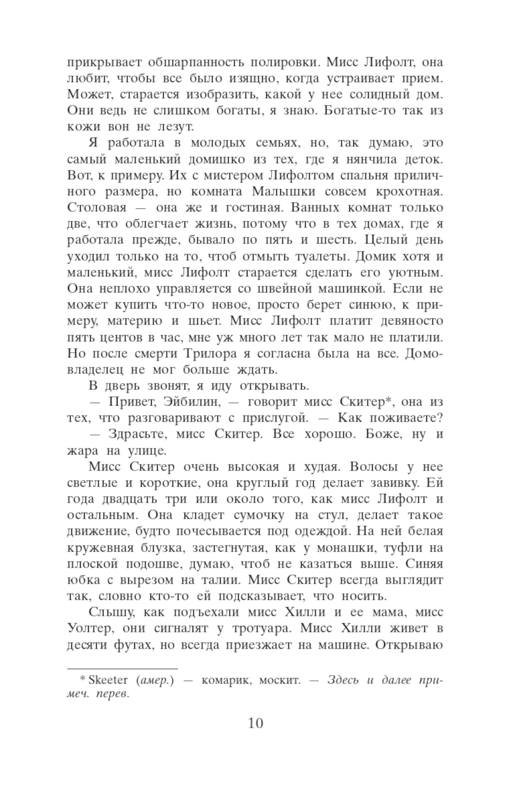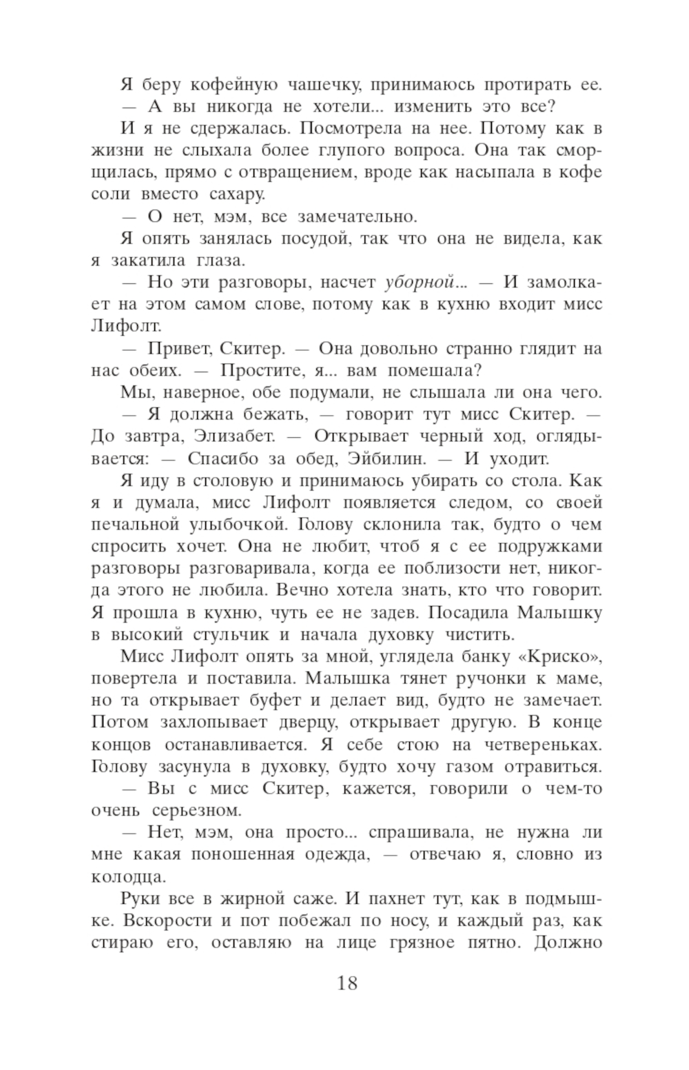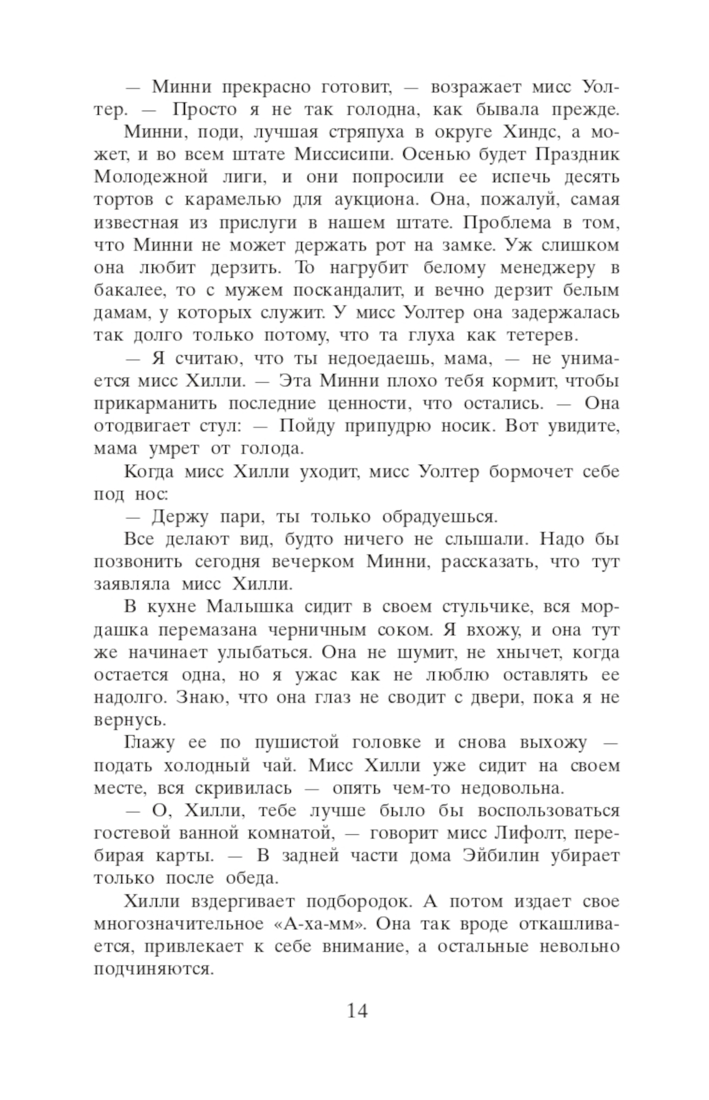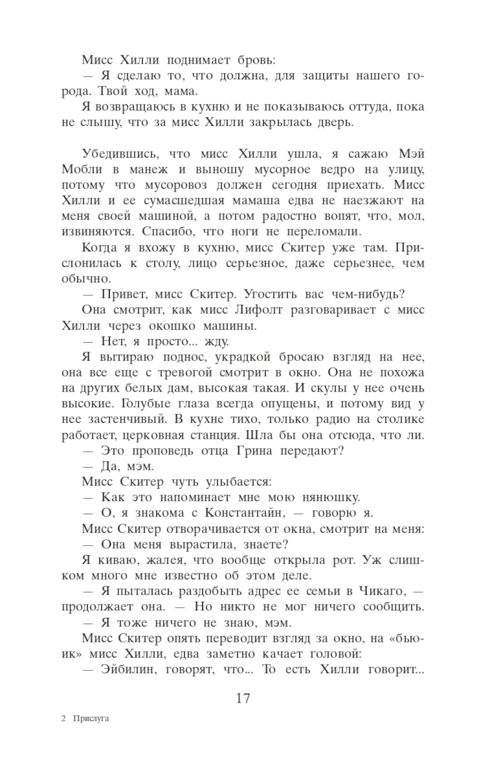 Американский Юг, на дворе 1960-е годы. Скитер только-только закончила университет и возвращается домой, в сонный городок Джексон, где никогда ничего не происходит. Она мечтает стать писательницей, вырваться в большой мир. Но приличной девушке с Юга не пристало тешиться столь глупыми иллюзиями, приличной девушке следует выйти замуж и хлопотать по дому. Мудрая Эйбилин на тридцать лет старше Скитер, она прислуживает в домах белых всю свою жизнь, вынянчила семнадцать детей и давно уже ничего не ждет от жизни, ибо сердце ее разбито после смерти единственного сына. Минни - самая лучшая стряпуха во всем Джексоне, а еще она самая дерзкая служанка в городе. И острый язык не раз уже сослужил ей плохую службу. На одном месте Минни никогда подолгу не задерживается. Но с Минни лучше не связываться даже самым высокомерным белым дамочкам. Двух черных служанок и белую неопытную девушку объединяет одно - обостренное чувство справедливости и желание хоть как-то изменить порядок вещей. Смогут ли эти трое противостоять целому миру? Сумеют ли они выжить в этой борьбе? В 2011 году роман был экранизирован, и фильм «Прислуга» стал одним из главных событий киносезона 2011-2012, номинирован на 4 премии «Оскар» и очень тепло принят зрителями. Сценарий написала сама Кэтрин Стокетт, а снял фильм режиссер Тэйт Тейлор.| Издательство | Фантом Пресс |