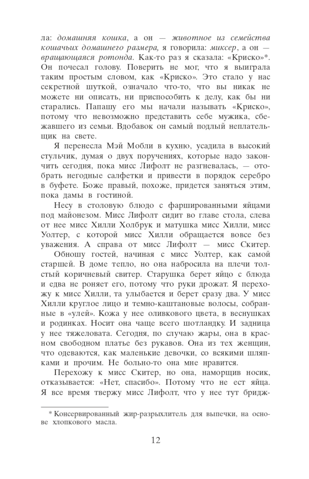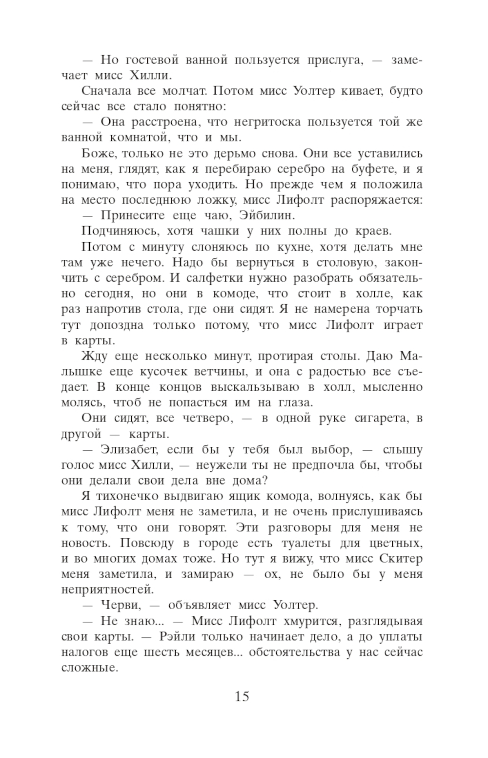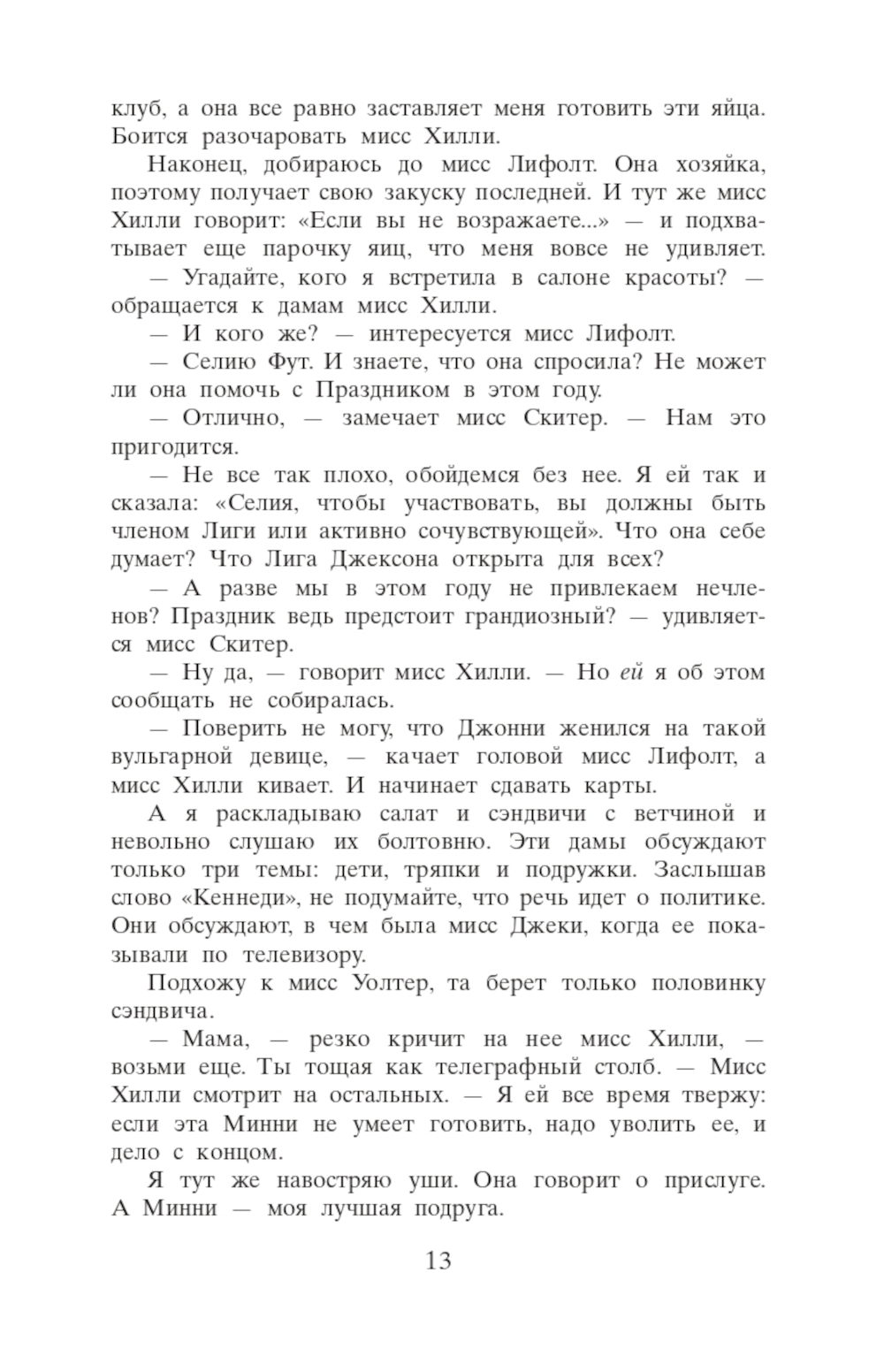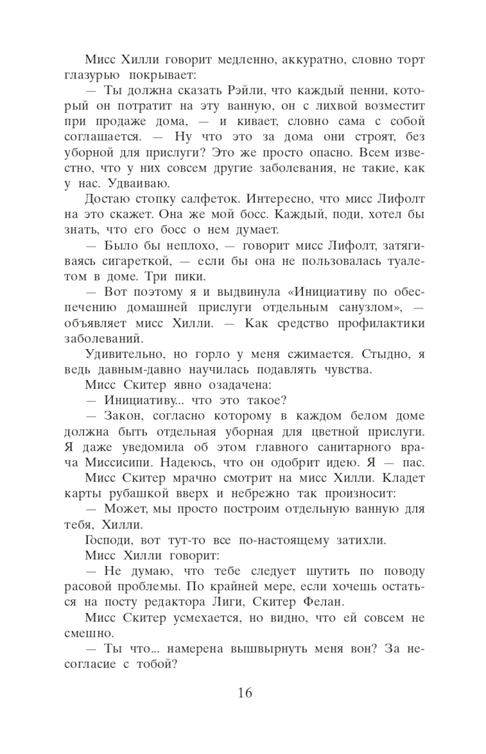 Американский Юг, на дворе 1960-е годы. Скитер только-только закончила университет и возвращается домой, в сонный городок Джексон, где никогда ничего не происходит. Она мечтает стать писательницей, вырваться в большой мир. Но приличной девушке с Юга не пристало тешиться столь глупыми иллюзиями, приличной девушке следует выйти замуж и хлопотать по дому. Мудрая Эйбилин на тридцать лет старше Скитер, она прислуживает в домах белых всю свою жизнь, вынянчила семнадцать детей и давно уже ничего не ждет от жизни, ибо сердце ее разбито после смерти единственного сына. Минни - самая лучшая стряпуха во всем Джексоне, а еще она самая дерзкая служанка в городе. И острый язык не раз уже сослужил ей плохую службу. На одном месте Минни никогда подолгу не задерживается. Но с Минни лучше не связываться даже самым высокомерным белым дамочкам. Двух черных служанок и белую неопытную девушку объединяет одно - обостренное чувство справедливости и желание хоть как-то изменить порядок вещей. Смогут ли эти трое противостоять целому миру? Сумеют ли они выжить в этой борьбе? В 2011 году роман был экранизирован, и фильм «Прислуга» стал одним из главных событий киносезона 2011-2012, номинирован на 4 премии «Оскар» и очень тепло принят зрителями. Сценарий написала сама Кэтрин Стокетт, а снял фильм режиссер Тэйт Тейлор.| Издательство | Фантом Пресс |