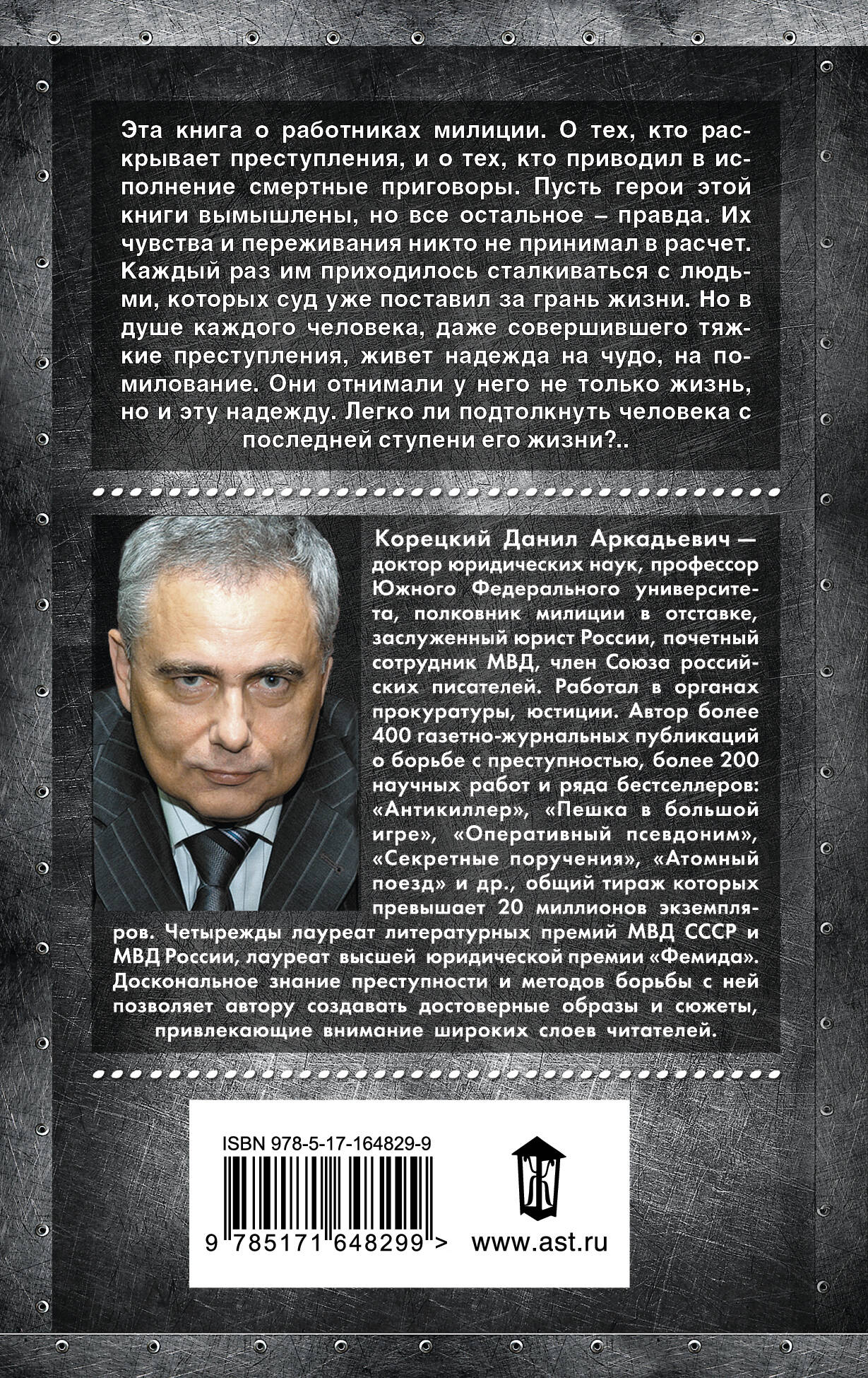 Эта книга о работниках милиции. О тех, кто раскрывает преступления, и о тех, кто приводил в исполнение смертные приговоры. Пусть герои этой книги вымышлены, но все остальное - правда. Их чувства и переживания никто не принимал в расчет. Каждый раз им приходилось сталкиваться с людьми, которых суд уже поставил за грань жизни. Но в душе каждого человека, даже совершившего тяжкие преступления, живет надежда на чудо, на помилование. Они отнимали у него не только жизнь, но и эту надежду. Легко ли подтолкнуть человека с последней ступени его жизни?..| Издательство | Издательство "АСТ" |
