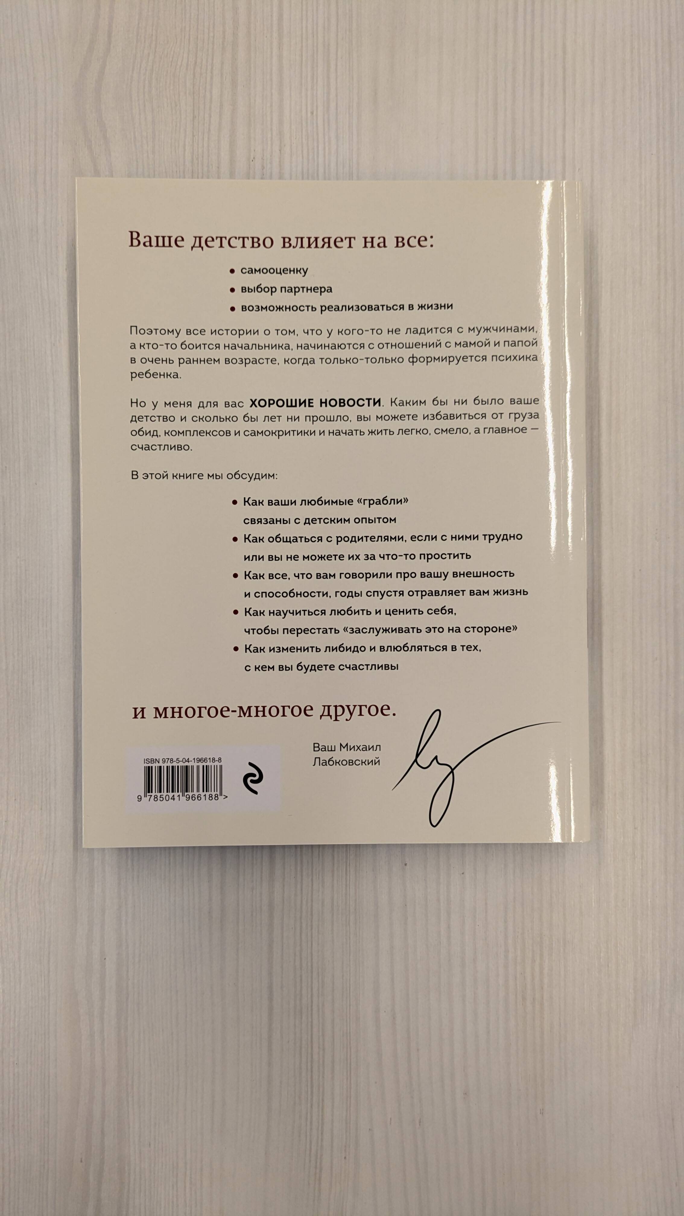 ДОЛГОЖДАННАЯ НОВИНКА от самого известного в России психолога Михаила Лабковского - о детских обидах, которые влияют на нашу взрослую жизнь. Автор книги уверен: нанесенные в детстве психологические травмы - как неправильно сросшаяся кость после перелома: идти можно, но медленно и превозмогая боль. Чтобы кость срослась правильно, придется вернуться в прошлое, к ситуациям, которые причинили боль, и понять, почему родители так себя вели. И если не получается простить, то хотя бы принять то, что с вами произошло. Ради самих себя, чтобы сбросить груз обид и комплексов, которые мешают расправить плечи и жить смело, легко, а главное - счастливо. Помимо детских обид, Михаил Лабковский поднимает множество важных тем. Как общаться с родителями, которые продолжают вас критиковать, не видят в вас взрослых, вмешиваются в личную жизнь. Как перестать выбирать партнеров, похожих на отца/мать, и вообще перестать жить по родительскому сценарию. Как научиться себя любить и ценить, чтобы не заслуживать этого на стороне. По традиции Михаил разбирает в книге множество реальных историй своих клиентов и слушателей. Это создает эффект групповой терапии: вы понимаете, что не одиноки в своих переживаниях, можете увидеть похожую на вашу ситуацию со стороны и услышать сильные слова психолога, сказанные с заботой.| Издательство | ООО "Издательство "Эксмо" |