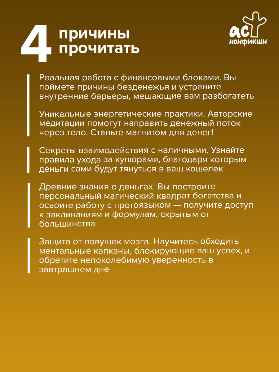 Практическое руководство по обращению с деньгами и самопрограммированию на богатство. Автор предлагает трансформировать свое денежное мышление и перестроить восприятие для того, чтобы достичь материального комфорта и уверенности в завтрашнем дне. Система поможет вам плавно перестроить восприятие и место финансов в вашей жизни, изменить и правильно настроить денежный поток, убрать все препятствия (особенно те, что ставит наш мозг) и внедрить практики привлечения денег. Авторские медитации, открывающие денежный поток, древние формулы протоязыка, ритуалы и магические практики, которые помогают усилить приход денег в вашу жизнь. Впустите в свою жизнь реальные изменения и финансовое благополучие!| Издательство | Издательство "АСТ" |