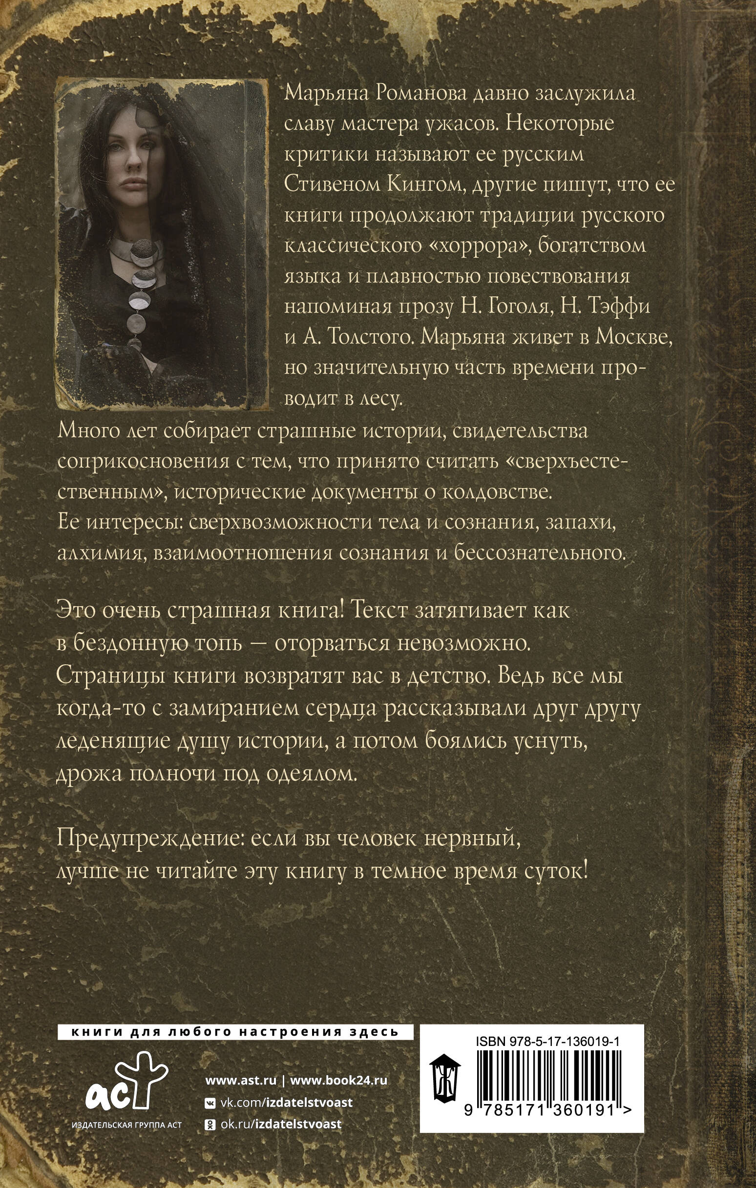 Марьяна Романова давно заслужила славу мастера ужасов. Некоторые критики называют ее русским Стивеном Кингом. Марьяна Романова названа «сенсацией сезона» 21-й «Битвы экстрасенсов» на ТНТ. Она много лет собирает страшные истории и свидетельства о соприкосновении со сверхъестественным.| Издательство | ИЗДАТЕЛЬСТВО "АСТ" |