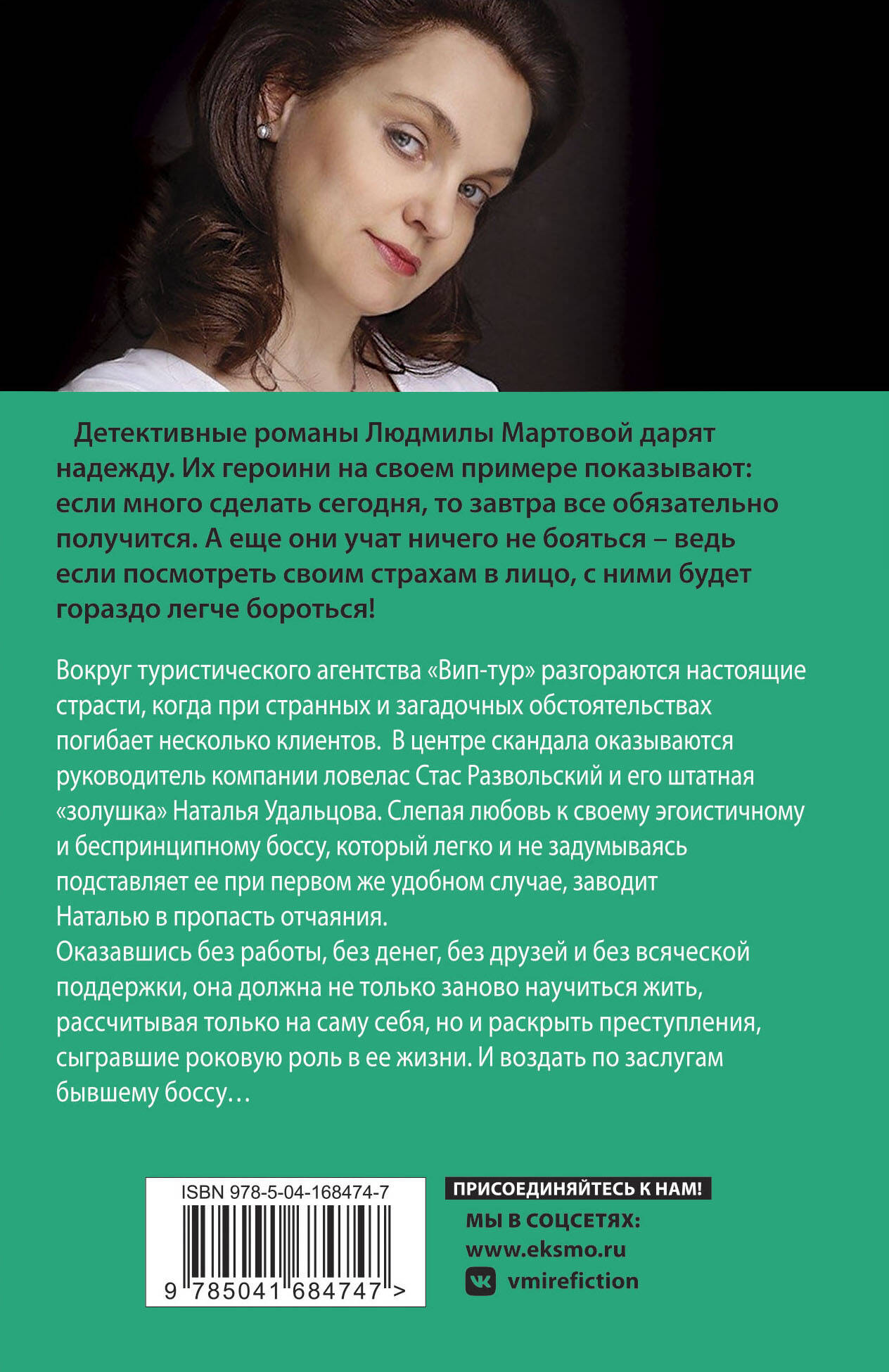 Вокруг туристического агентства «Вип-тур» разгораются настоящие страсти, когда при странных и загадочных обстоятельствах погибает несколько клиентов. В центре скандала оказываются руководители компании - ловелас Стас Развольский и его штатная «золушка» - Наталья Удальцова. Слепая любовь к своему эгоистичному и беспринципному боссу, который легко и не задумываясь подставляет ее при первом же удобном случае, заводит Наталью в пропасть отчаяния. Оказавшись без работы, без денег, без друзей и без всяческой поддержки, она должна не только заново научиться жить, рассчитывая только на саму себя, но и раскрыть преступления, сыгравшие роковую роль в ее жизни. И воздать по заслугам бывшему боссу… Людмила Мартова - мастер увлекательной детективной мелодрамы, автор захватывающих остросюжетных историй. Их отличают закрученная детективная интрига, лихой финал с неожиданной развязкой и, конечно же, яркая любовная линия. Героини романов Людмилы Мартовой - современные молодые женщины, которые точно знают, чего хотят от жизни.| Издательство | ООО "Издательство "Эксмо" |