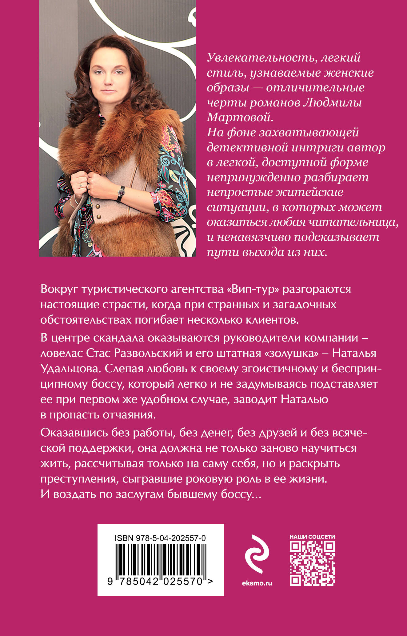 Вокруг туристического агентства «Вип-тур» разгораются настоящие страсти, когда при странных и загадочных обстоятельствах погибают несколько клиентов. В центре скандала оказываются руководители компании - ловелас Стас Развольский и его штатная «золушка» - Наталья Удальцова. Слепая любовь к своему эгоистичному и беспринципному боссу, который легко и не задумываясь подставляет ее при первом же удобном случае, заводит Наталью в пропасть отчаяния. Оказавшись без работы, без денег, без друзей и без всяческой поддержки, она должна не только заново научиться жить, рассчитывая только на саму себя, но и раскрыть преступления, сыгравшие роковую роль в ее жизни. И воздать по заслугам бывшему боссу… Людмила Мартова - мастер увлекательной детективной мелодрамы, автор захватывающих остросюжетных историй. Их отличают закрученная детективная интрига, лихой финал с неожиданной развязкой и, конечно же, яркая любовная линия. Героини романов Людмилы Мартовой - современные молодые женщины, которые точно знают, чего хотят от жизни.