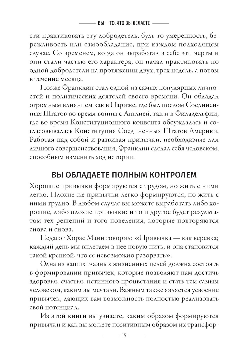 Наши мысли, наши чувства и наши поступки на 95 % предопределяются нашими привычками. Привычки имеют глубокие корни, но мы способны их изменить: отжившие свое и ставшие вредными привычки можно заменить новыми, полезными - и это сразу же принесет свои плоды. В этой книге Трейси учит читателей развивать привычки, присущие успешным людям, чтобы они могли принимать более разумные решения и в конечном счете удвоили, а то и утроили свои доходы. Вы узнаете: - как оптимально распоряжаться своими финансами; - как укрепить здоровье и улучшить самочувствие; - как научиться жить в ладу с другими людьми; - как достичь финансовой независимости; - и как стать настоящим лидером, который свои мечты претворяет в реальность.