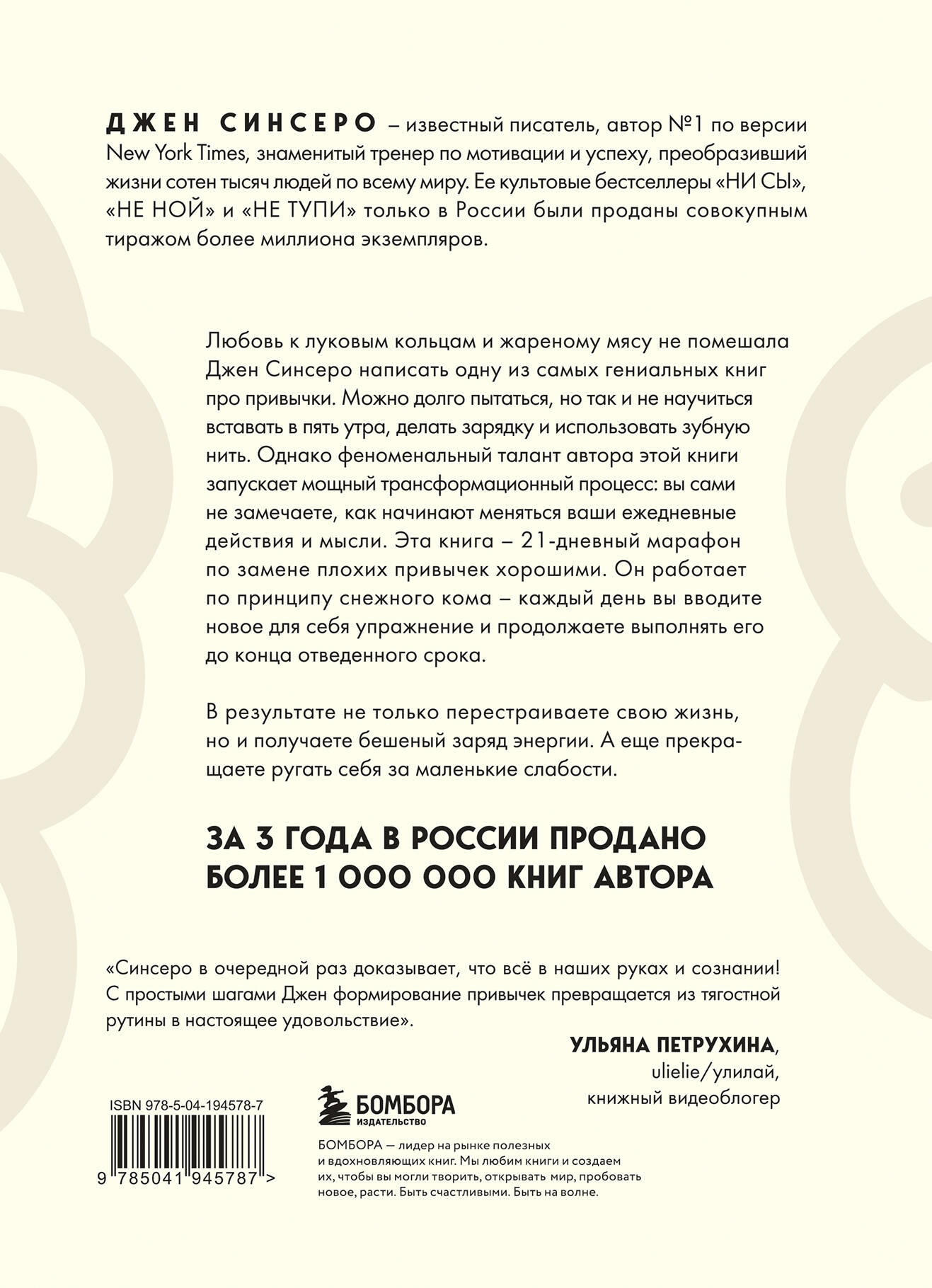 ОТ АВТОРА САМЫХ ПРОДАЮЩИХСЯ КНИГ В РОССИИ! Книги Джен Синсеро стали мировым феноменом. «НИ СЫ» вот уже более трех лет находится в ТОП-20 AMAZON. Тексты этого автора заряжены на трансформацию жизни: невозможно «просто прочитать» их, хочется сразу начать меняться. «НИ ЗЯ. Откажись от пагубных слабостей, обрети силу духа и стань хозяином своей судьбы» - это не просто очередная книга по саморазвитию. Она выделяется из общей массы своей самобытностью, подачей и неожиданными инсайтами. Книга рассказывает о том, как у нас формируются привычки, зачем они нужны и что вообще можно считать «привычкой». Благодаря этой книге вы: • Получите безудержную мотивацию для достижения целей. • Сможете избавиться от негативных установок и всего, что тянет вас на дно. • Наконец-то оторвете пятую точку от дивана и начнете действовать. • Настроите свое подсознание на поиск возможностей. Мало кто знает, но наша жизнь на 70% состоит из привычек. И они могут быть не только физическими, но и ментальными. Научиться пить воду по утрам и класть ключи от машины на место можно и самостоятельно. А вот перестать ругать себя за промахи и начать видеть собственные достижения сможет не каждый. А ведь жить в негативе - это тоже привычка. Об авторе Джен Синсеро - автор № 1 по версии New York Times, знаменитый мотивационный тренер, путешествующий по всему свету со своими выступлениями. «Синсеро в очередной раз доказывает, что все в наших руках и сознании! С простыми шагами Джен формирование привычек превращается из тягостной рутины в настоящее удовольствие». - УЛЬЯНА ПЕТРУХИНА, Ulielie, книжный видеоблогер| Издательство | ООО "Издательство "Эксмо" |