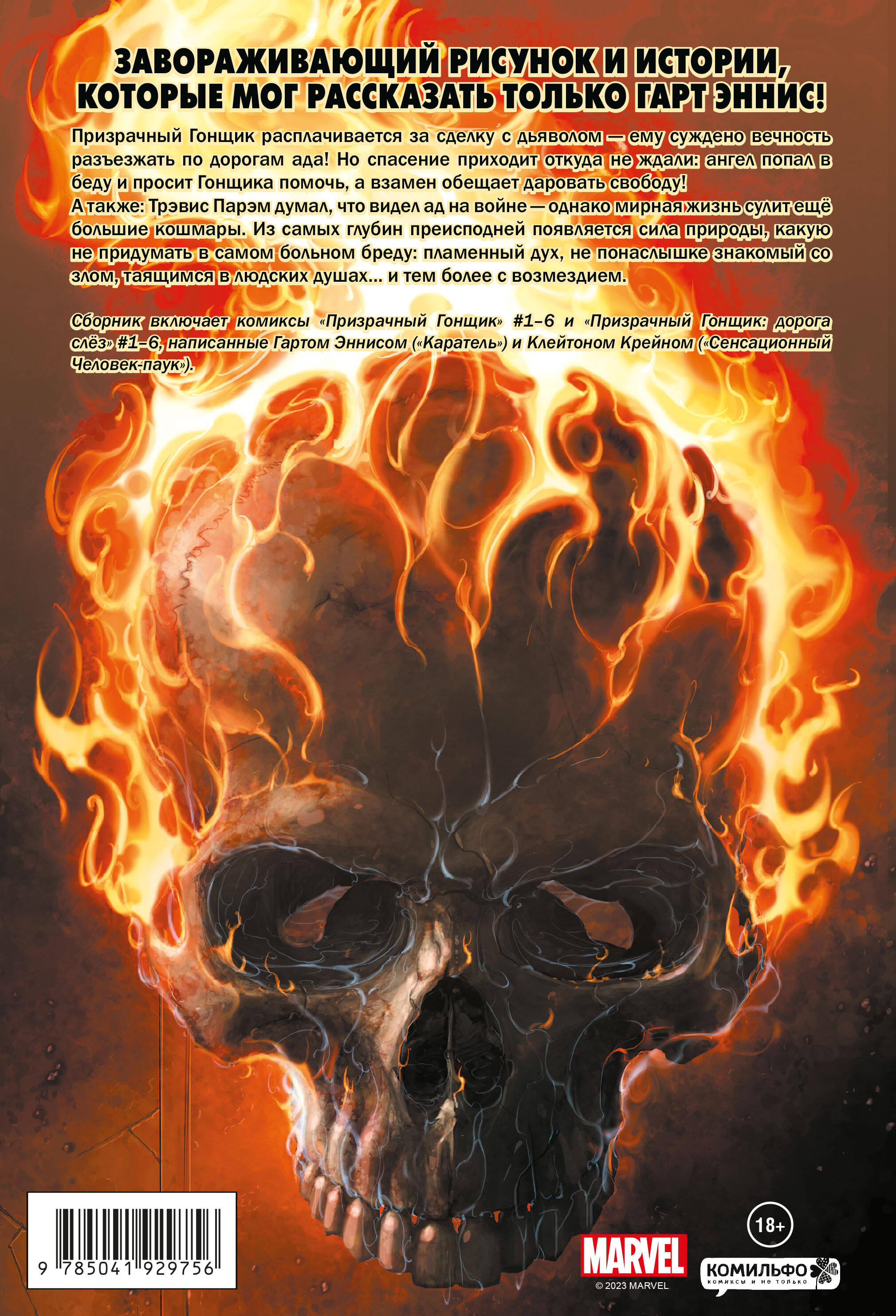 Завораживающий рисунок и истории, которые мог рассказать только Гарт Эннис! Призрачный Гонщик расплачивается за сделку с дьяволом - ему суждено вечность разъезжать по дорогам ада! Но спасение приходит откуда не ждали: ангел попал в беду и просит Гонщика помочь, а взамен обещает даровать свободу! А также: Трэвис Парэм думал, что видел ад на войне - однако мирная жизнь сулит ещё большие кошмары. Из самых глубин преисподней появляется сила природы, какую не придумать в самом больном бреду: пламенный дух, не понаслышке знакомый со злом, таящимся в людских душах… и тем более с возмездием. Сборник включает комиксы «Призрачный Гонщик» #1-6 и «Призрачный Гонщик: дорога слёз» #1-6, написанные Гартом Эннисом («Каратель») и Клейтоном Крейном («Сенсационный Человек-паук»).
