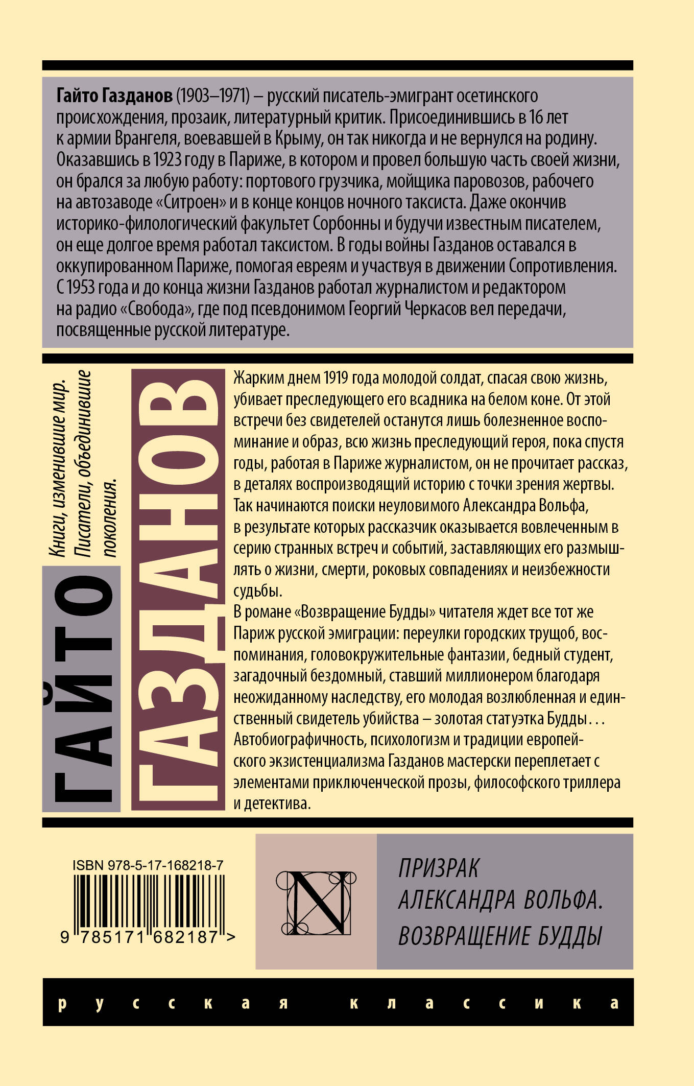 - Гайто Газданов - выдающийся русский писатель-прозаик и литературный критик XX века. Все свои произведения он создал уже в эмиграции, и на родине его имя долгое время оставалось неизвестным - признание в России пришло к Газданову уже после смерти, российские читатели открыли книги автора только в начале девяностых годов. - Газданов прежде всего известен по романам «Вечер у Клэр», «Ночные дороги» и «Возвращение Будды». Роман «Вечер у Клэр» высоко оценили Бунин и Горький. Критики особо отмечали невероятное чувство слова и ритма, завораживающую магию рассказчика, тонкую иронию и лирическое изображение окружающей действительности. - В этот сборник вошли два известных произведения автора - «Возвращение Будды» и «Призрак Александра Вольфа».| Издательство | Издательство "АСТ" |