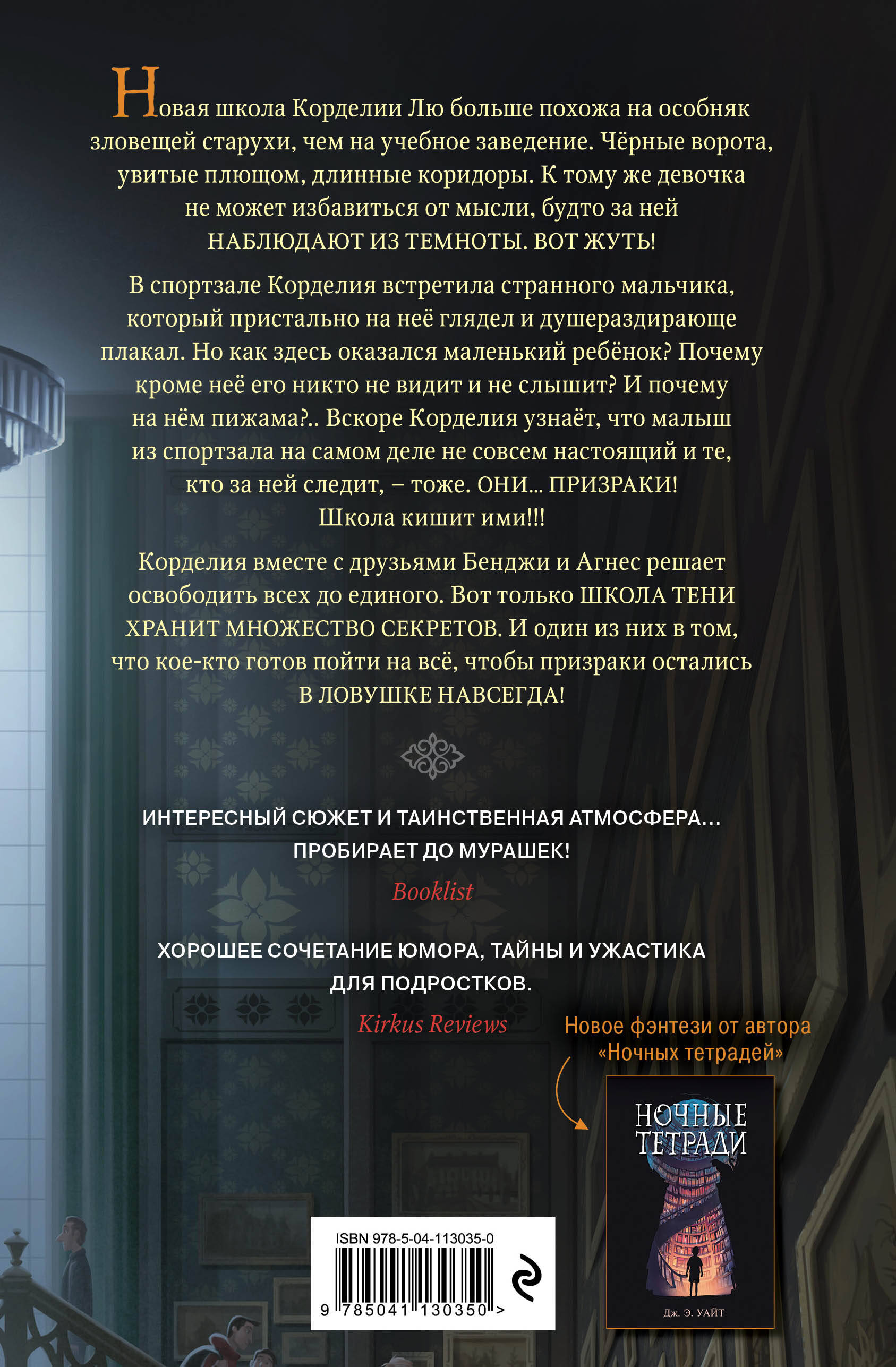 Новая фэнтези-серия от автора бестселлера «НОЧНЫЕ ТЕТРАДИ» Дж. Э. Уайта! «Школа Тени» для поклонников атмосферных и загадочных историй в стиле «Каролины в Стране Кошмаров» Нила Геймана, сказок Братьев Гримм и «Дома странных детей». Новая школа Корделии снаружи больше похожа на старинный викторианский особняк, чем на учебное заведение. Но это ерунда по сравнению с тем, что происходит внутри! Корделии постоянно кажется, что за ней кто-то наблюдает из темноты. И ей не кажется!.. В спортзале она встречает ребенка в пижамке с паровозиком на груди, который постоянно плачет. Скоро выяснится, что малыша кроме нее никто больше не видит. А ещё это место кишит призраками! И тот мальчик в пижаме только один из них…| Издательство | ООО "Издательство "Эксмо" |