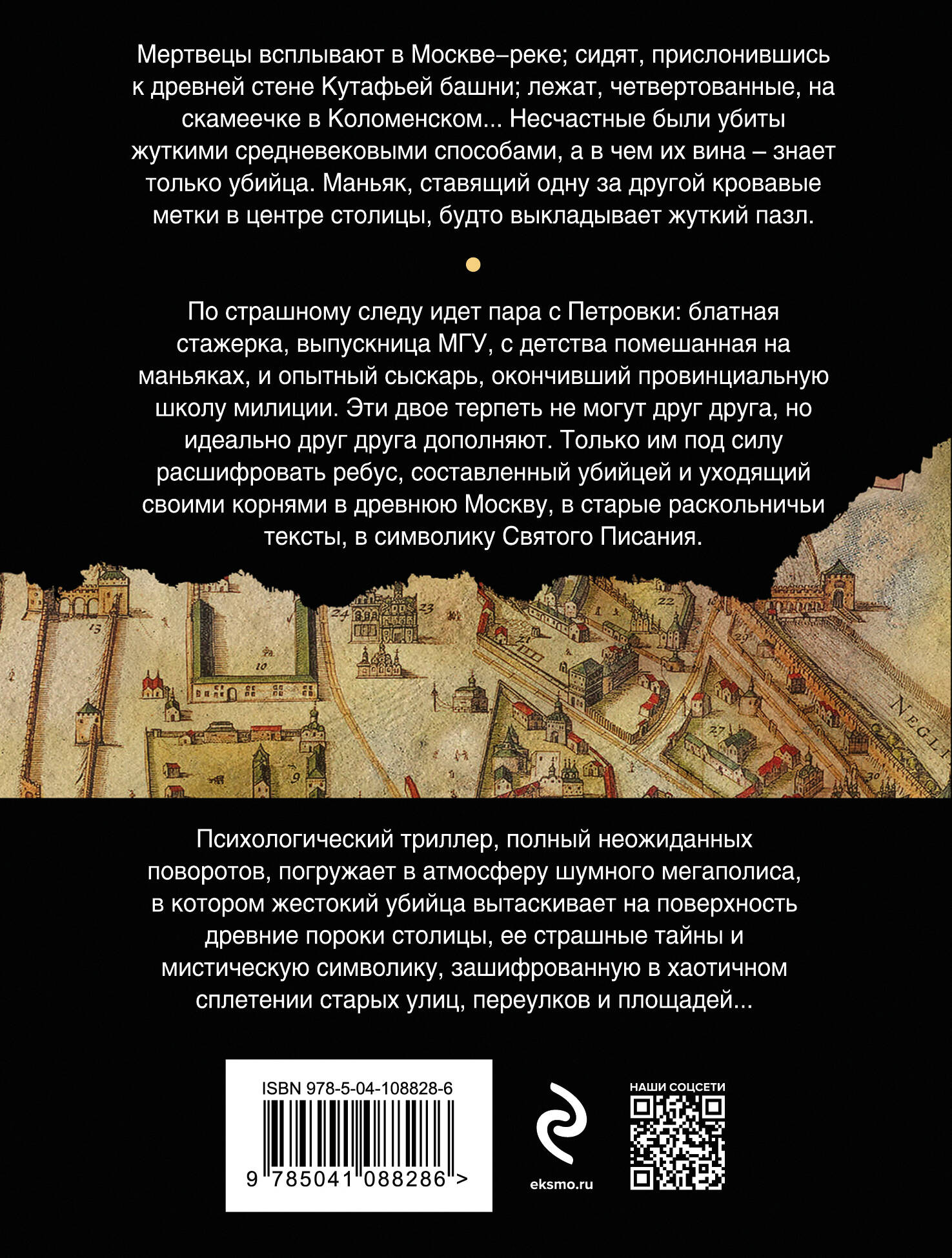 Мертвецы всплывают в Москве-реке; сидят, прислонившись к древней стене Кутафьей башни; лежат, четвертованные, на скамеечке в Коломенском... Несчастные были убиты жуткими средневековыми способами, а в чем их вина - знает только убийца. Маньяк, ставящий одну за другой кровавые метки в центре столицы, будто выкладывает жуткий пазл. По страшному следу идет пара с Петровки: блатная стажерка, выпускница МГУ, с детства помешанная на маньяках, и опытный сыскарь, окончивший провинциальную школу милиции. Эти двое терпеть не могут друг друга, но идеально друг друга дополняют. Только им под силу расшифровать ребус, составленный убийцей и уходящий своими корнями в древнюю Москву, в старые раскольничьи тексты, в символику Святого Писания. Психологический триллер, полный неожиданных поворотов, погружает в атмосферу шумного мегаполиса, в котором жестокий убийца вытаскивает на поверхность древние пороки столицы, ее страшные тайны и мистическую символику, зашифрованную в хаотичном сплетении старых улиц, переулков и площадей... Детективы Дарьи Дезомбре отличает наличие тонкой интриги, мистических тайн и детального экскурса в историю, культуру и искусство. Над каждой новой книгой Дезомбре работает кропотливо. Воссоздавая прошлое, она читает мемуары, проводит много часов в библиотеках и музеях, собирает фотографии одежды и предметов прошлых эпох из семейных альбомов, журналов. Все книги автора переведены на иностранные языки и пользуются популярностью в Европе.| Издательство | ООО "Издательство "Эксмо" |