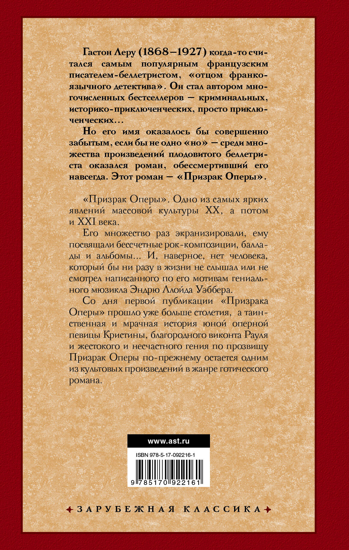 "Призрак Оперы". Одно из самых ярких явлений массовой культуры ХХ, а потом и XXI века. Его множество раз экранизировали, ему посвящали бессчетные рок-композиции, баллады и альбомы... И, наверное, нет человека, который бы ни разу в жизни не слышал или не смотрел написанного по его мотивам гениального мюзикла Эндрю Ллойда Уэббера. Со дня первой публикации "Призрака Оперы" прошло уже больше столетия, а таинственная и мрачная история юной оперной певицы Кристины, благородного виконта Рауля и жестокого и несчастного гения по прозвищу "Призрак Оперы" по-прежнему остается одним из культовых произведений в жанре "готического романа".| Издательство | Издательство "АСТ" |