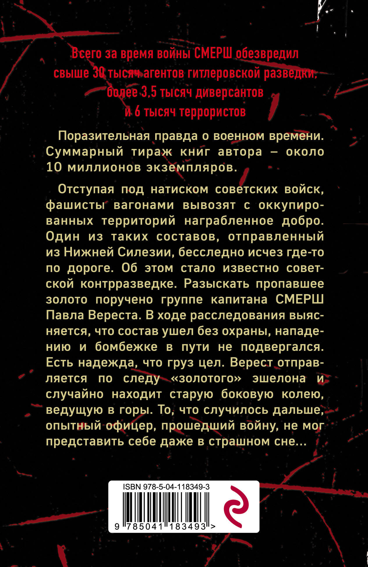 Поразительная правда о военном времени. Суммарный тираж книг автора - около 10 миллионов экземпляров. Отступая под натиском советских войск, фашисты вагонами вывозят с оккупированных территорий награбленное добро. Один из таких составов, отправленный из Нижней Силезии, бесследно исчез где-то по дороге. Об этом стало известно советской контрразведке. Разыскать пропавшее золото поручено группе капитана СМЕРШ Павла Вереста. В ходе расследования выясняется, что состав ушел без охраны, нападению и бомбежке в пути не подвергался. Есть надежда, что груз цел. Верест отправляется по следу «золотого» эшелона и случайно находит старую боковую колею, ведущую в горы. То, что случилось дальше, опытный офицер, прошедший войну, не мог представить себе даже в страшном сне…| Издательство | ООО "Издательство "Эксмо" |