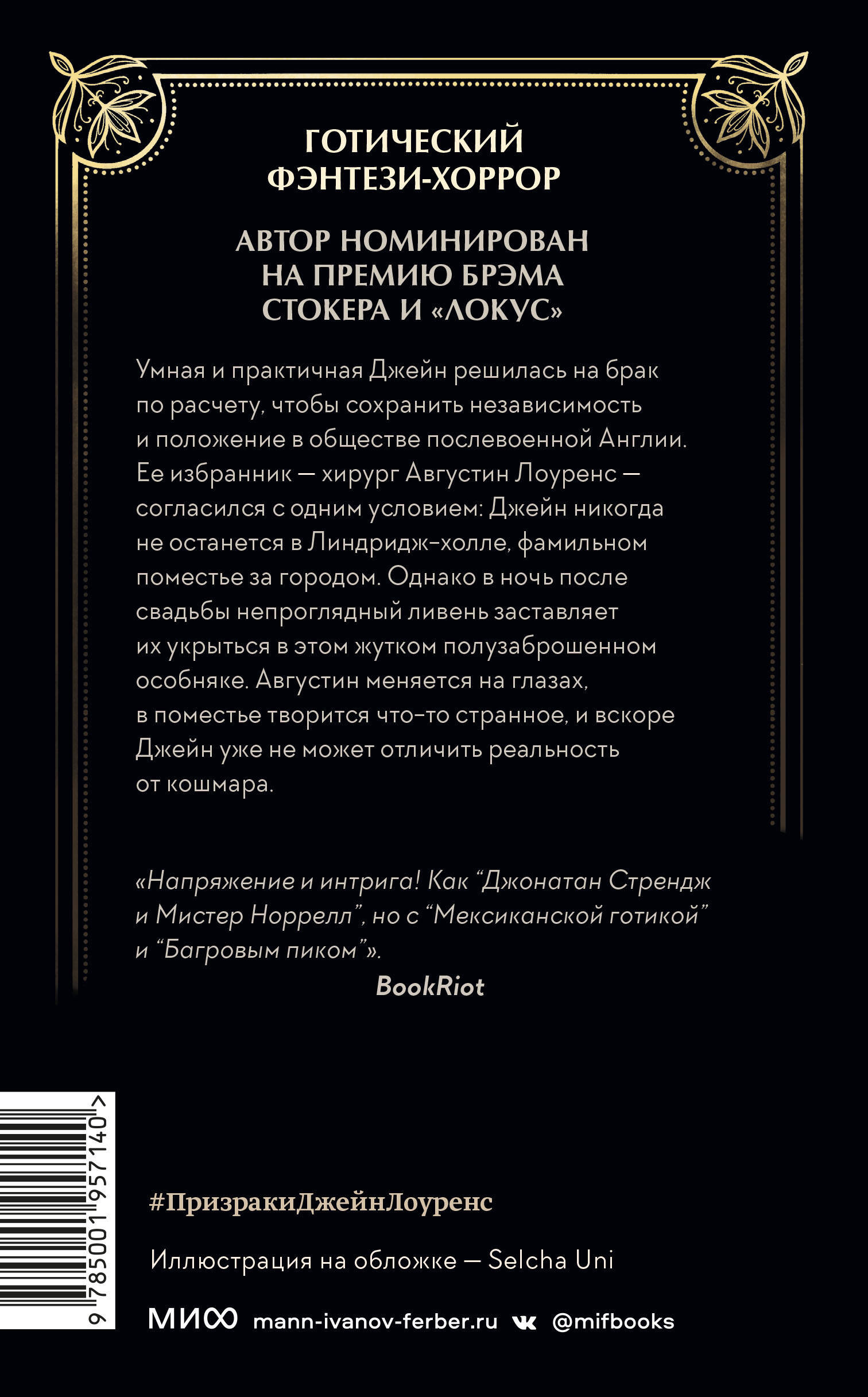 Умная и практичная Джейн решилась на брак по расчету, чтобы сохранить независимость и положение в обществе послевоенной Англии. Ее избранник - хирург Августин Лоуренс - согласился с одним условием: Джейн никогда не останется в Линдридж-холле, фамильном поместье за городом. Однако в ночь после свадьбы непроглядный ливень заставляет их укрыться в этом жутком полузаброшенном особняке. Августин меняется на глазах, в поместье творится что-то странное, и вскоре Джейн уже не может отличить реальность от кошмара. Для кого эта книга Для поклонников романов "Мексиканская готика" Сильвии Морено-Гарсиа, "Призраки дома на холме" Ширли Джексон, "Анна в кроваво-алом" Кендари Блейк и "Горький апельсин" Клэр Фуллер. Для любителей готических хорроров с таинственной устрашающей атмосферой.| Издательство | МАНН, ИВАНОВ И ФЕРБЕР ООО |