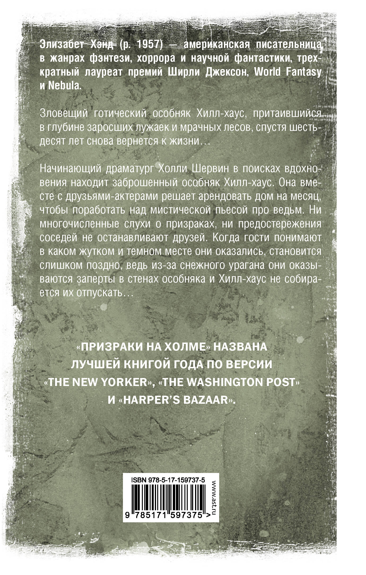 Зловещий готический особняк Хилл-хаус, притаившийся в глубине заросших лужаек и мрачных лесов, спустя шестьдесят лет снова вернется к жизни… Начинающий драматург Холли Шервин в поисках вдохновения находит заброшенный особняк Хилл-хаус. Она вместе с друзьями-актерами решает арендовать дом на месяц, чтобы поработать над мистической пьесой про ведьм. Ни многочисленные слухи о призраках, ни предостережения соседей не останавливают друзей. Когда гости понимают в каком жутком и темном месте они оказались, становится слишком поздно, ведь из-за снежного урагана они оказываются заперты в стенах особняка и Хилл-хаус не собирается их отпускать…| Издательство | Издательство "АСТ" |
