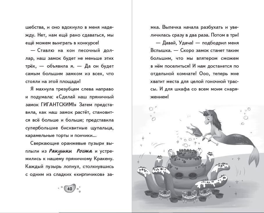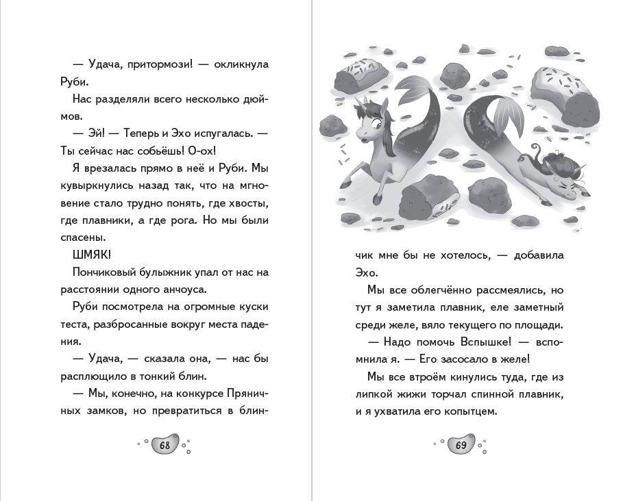 Наполовину единорог, наполовину русалка. А вся целиком, от рога до русалочьего хвоста, я просто прелесть! И зовут меня Удача! Пряничный Кракен! Он такой чудесный! Мы сделали его с друзьями для кулинарного конкурса. Руби фантастически готовит, я неплохо рисую, а Нелия обладает магией, без которой нам не обойтись. Но когда мы увидели творения других конкурсантов, наши хвосты и рожки поникли. Их постройки выглядели великолепно, да ещё и были выше нашего Кракена. И как же мы теперь выиграем конкурс? Кажется, у меня есть одна идея, только она, как всегда - безумная! ЕДИНОРОГИ невероятно ПОПУЛЯРНЫЕ ЖИВОТНЫЕ! Это добрые и утончённые создания, которые умеют творить чудеса и очень нравятся современным детям. А РУСАЛКИ-ЕДИНОРОГИ - это что-то новое и интересное, ТАКОГО ВЫ ЕЩЁ НЕ ВИДЕЛИ! Истории перенесут в волшебный подводный мир, где живут эти диковинные существа, помогут поверить в себя, если у ребёнка есть с этим проблемы. Расскажут простым языком о том, для чего нужны друзья и как их найти. Книгу удобно держать в детских руках, она небольшого формата. Внутри чёрно-белые милые иллюстрации. Крупный шрифт и простой текст, который ребёнок сможет прочитать сам, без помощи взрослых.| Издательство | ООО "Издательство "Эксмо" |