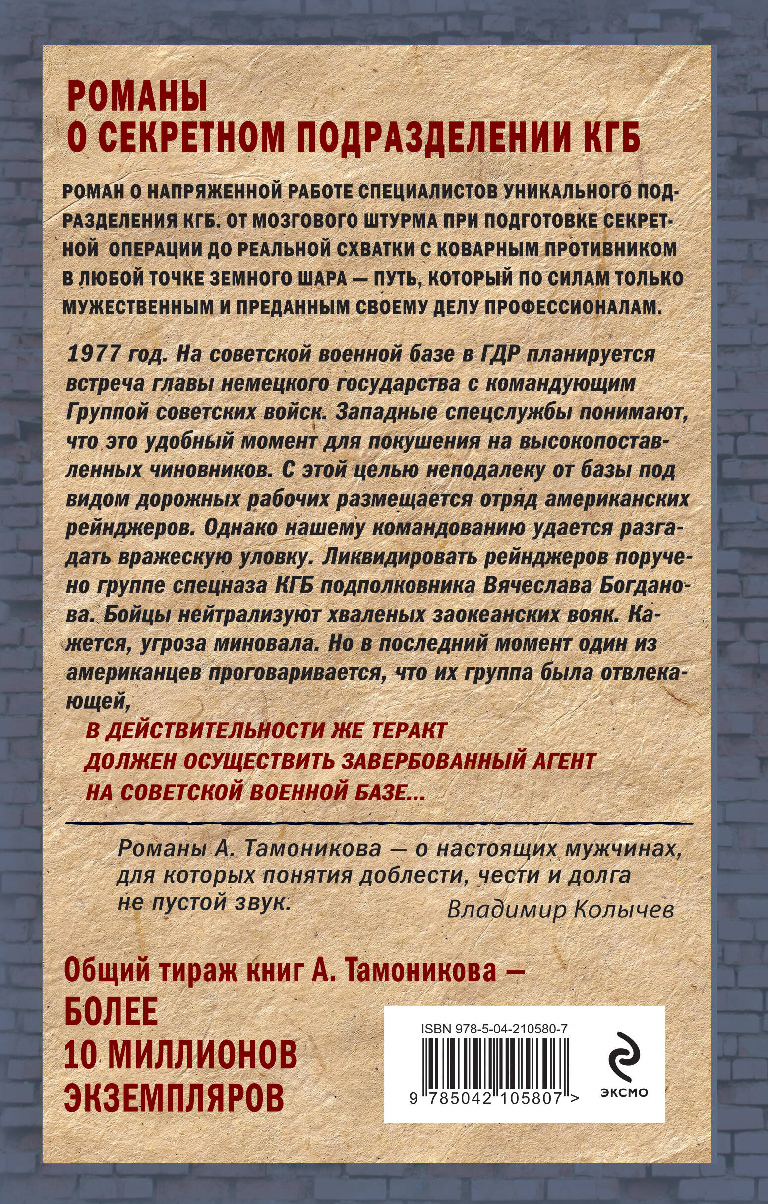 1977 год. На советской военной базе в ГДР планируется встреча главы немецкого государства с командующим Группой советских войск. Западные спецслужбы понимают, что это удобный момент для покушения на высокопоставленных чиновников. С этой целью неподалеку от базы под видом дорожных рабочих размещается отряд американских рейнджеров. Однако нашему командованию удается разгадать вражескую уловку. Ликвидировать рейнджеров поручено группе спецназа КГБ подполковника Вячеслава Богданова. Бойцы нейтрализуют хваленых заокеанских вояк. Кажется, угроза миновала. Но в последний момент один из американцев проговаривается, что их группа была отвлекающей, в действительности же теракт должен осуществить завербованный агент на советской военной базе… Роман о напряженной работе специалистов уникального подразделения КГБ. От мозгового штурма при подготовке секретной операции до реальной схватки с коварным противником в любой точке земного шара - путь, который по силам только мужественным и преданным своему делу профессионалам. «Романы А. Тамоникова - о настоящих мужчинах, для которых понятия доблести, чести и долга - не пустой звук». - В. Колычев Общий тираж книг А. Тамоникова - более 10 миллионов экземпляров.| Издательство | ООО "Издательство "Эксмо" |