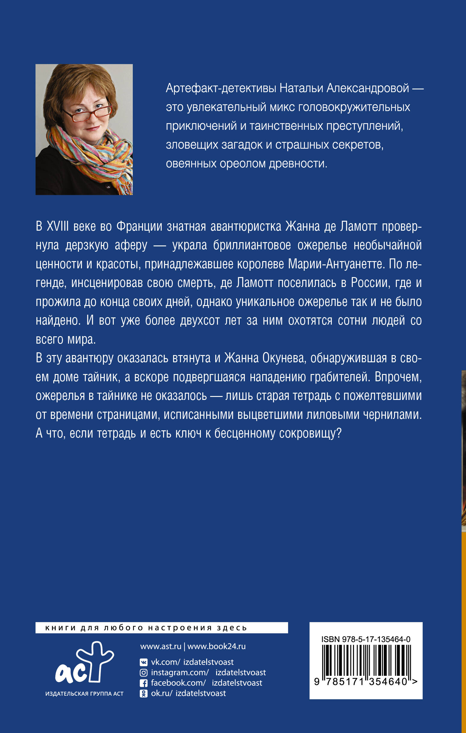 Новинка в серии «Роковой артефакт»! Захватывающая история про авантюристку XVIII века Жанну де Ламотт и нашу современницу Жанну Окуневу, которая разгадывает тайны прошлого. Более двухсот лет назад Жанна де Ламотт украла бесценное ожерелье Марии-Антуанетты, но куда подевалась воровка и где спрятала ожерелье, неизвестно. Возможно, инсценировав свою смерть, она тайком обосновалась в России, где и провела остаток жизни. У Жанны Окуневой свои неприятности - проблемы с личной жизнью, работой, деньгами. Но к чему она точно была не готова, так это к визиту грабителей, которые покусились на тайник, устроенный в старой печи. Впрочем, сокровищ внутри не оказалось, нашлась лишь старая тетрадь с пожелтевшими от времени страницами. А вдруг в этой тетради и таится ключ к поиску ожерелья? Увлекательно, легко, в лучших традициях жанра!| Издательство | ИЗДАТЕЛЬСТВО "АСТ" |