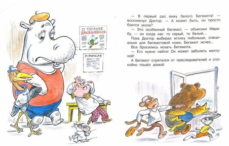 «Про бегемота, который боялся прививок» - добрая, чудесная сказка классика детской литературы В. Сутеева, написанная по мотивам сказки чешского автора Милоша Мацуорека. Малыши знают её по замечательному мультфильму.
