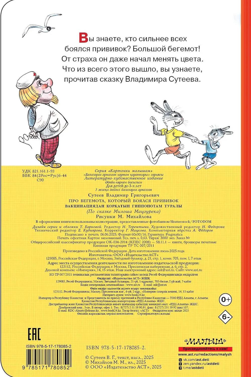Вы знаете, кто сильнее всех боялся прививок? Большой бегемот! От страха он даже начал менять цвета. Что из всего этого вышло, вы узнаете, прочитав сказку Владимира Сутеева.| Издательство | АСТ |