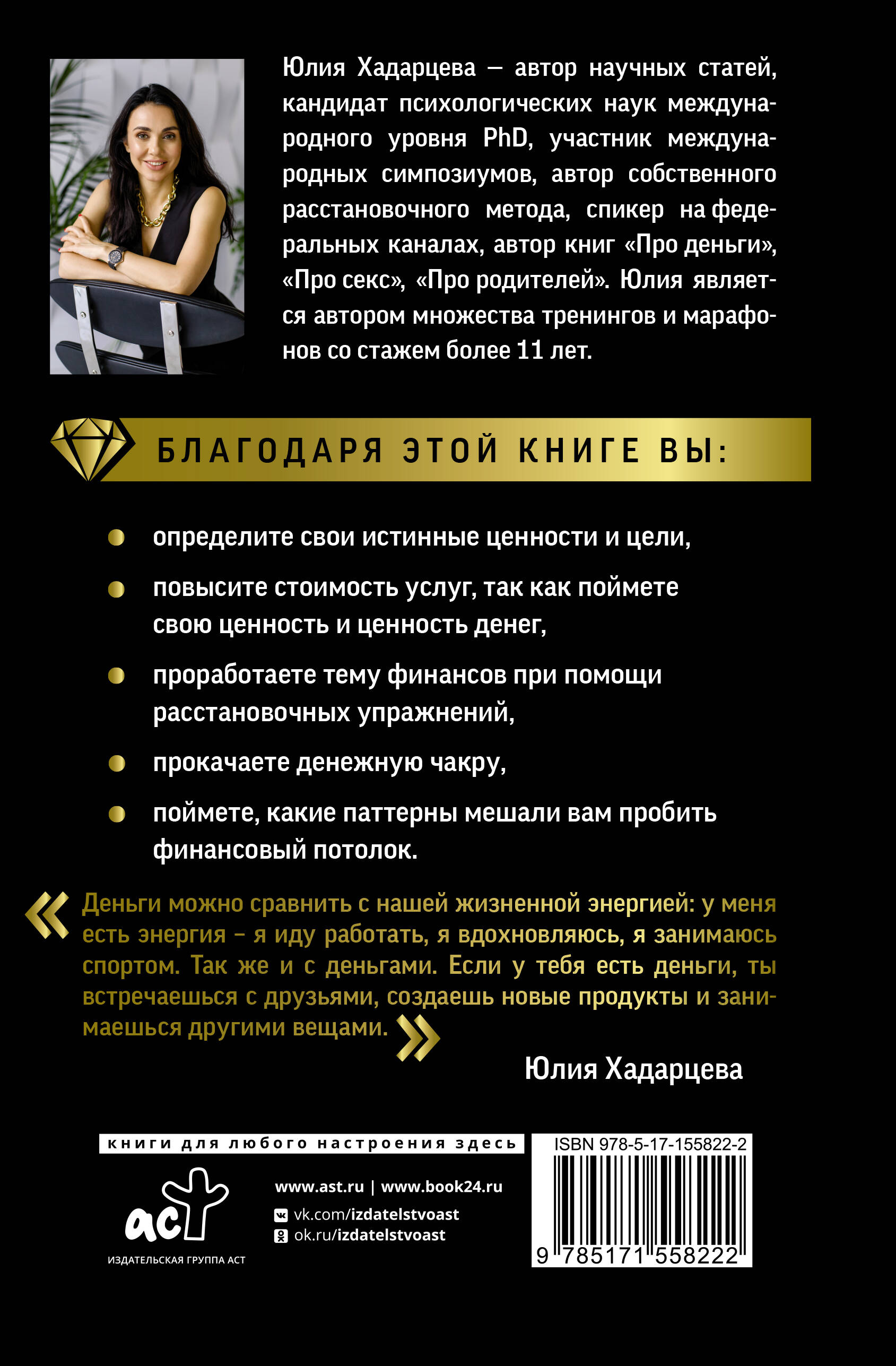 Как пробить финансовый потолок и понять, что мешает вырасти в доходах? Какие паттерны поведения и глубинные установки препятствуют росту во всех сферах и в первую очередь в финансах? Как правильно ставить цели и достигать их? Уже сейчас вы сможете найти ответы на эти и другие вопросы в книге "Про деньги". Ее автор Юлия Хадарцева - лидер в системе метода расстановок в России, мировой рекордсмен по расстановкам, кандидат психологических наук, эксперт федеральных каналов, а также автор тренингов и марафонов, которые прошли более 35 000 человек. Книга "Про деньги" содержит в себе больше информации, чем курсы по финансовой грамотности. Это книга-практикум. В ней автор дает глубокие расстановочные упражнения. Выполняя их, вы поймете, как вырасти в финансах и выйти на новые уровни во всех сферах своей жизни. В книгу включены ценные материалы, переданные Юлии ее учителем Бертом Хеллингером, немецким психотерапевтом. Вся серия книг Юлии построена на практическом подходе, поэтому мы также рекомендуем вам прочесть книги "Про родителей" и "Про секс".