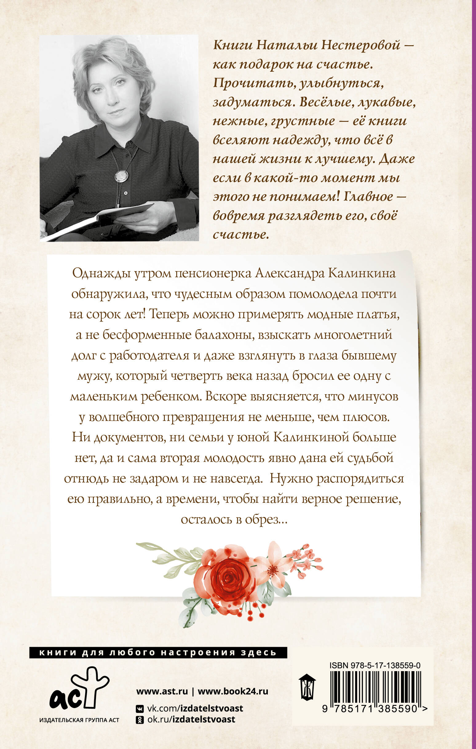 Однажды утром пенсионерка Александра Калинкина обнаружила, что чудесным образом помолодела почти на сорок лет! Теперь можно примерять модные платья, а не бесформенные балахоны, взыскать многолетний долг с работодателя и даже взглянуть в глаза бывшему мужу, который четверть века назад бросил ее одну с маленьким ребенком. Вскоре выясняется, что минусов у волшебного превращения не меньше, чем плюсов. Ни документов, ни семьи у юной Калинкиной больше нет, да и сама вторая молодость явно дана ей судьбой отнюдь не задаром и не навсегда. Нужно распорядиться ею правильно, а времени, чтобы найти верное решение, осталось в обрез…| Издательство | АСТ |