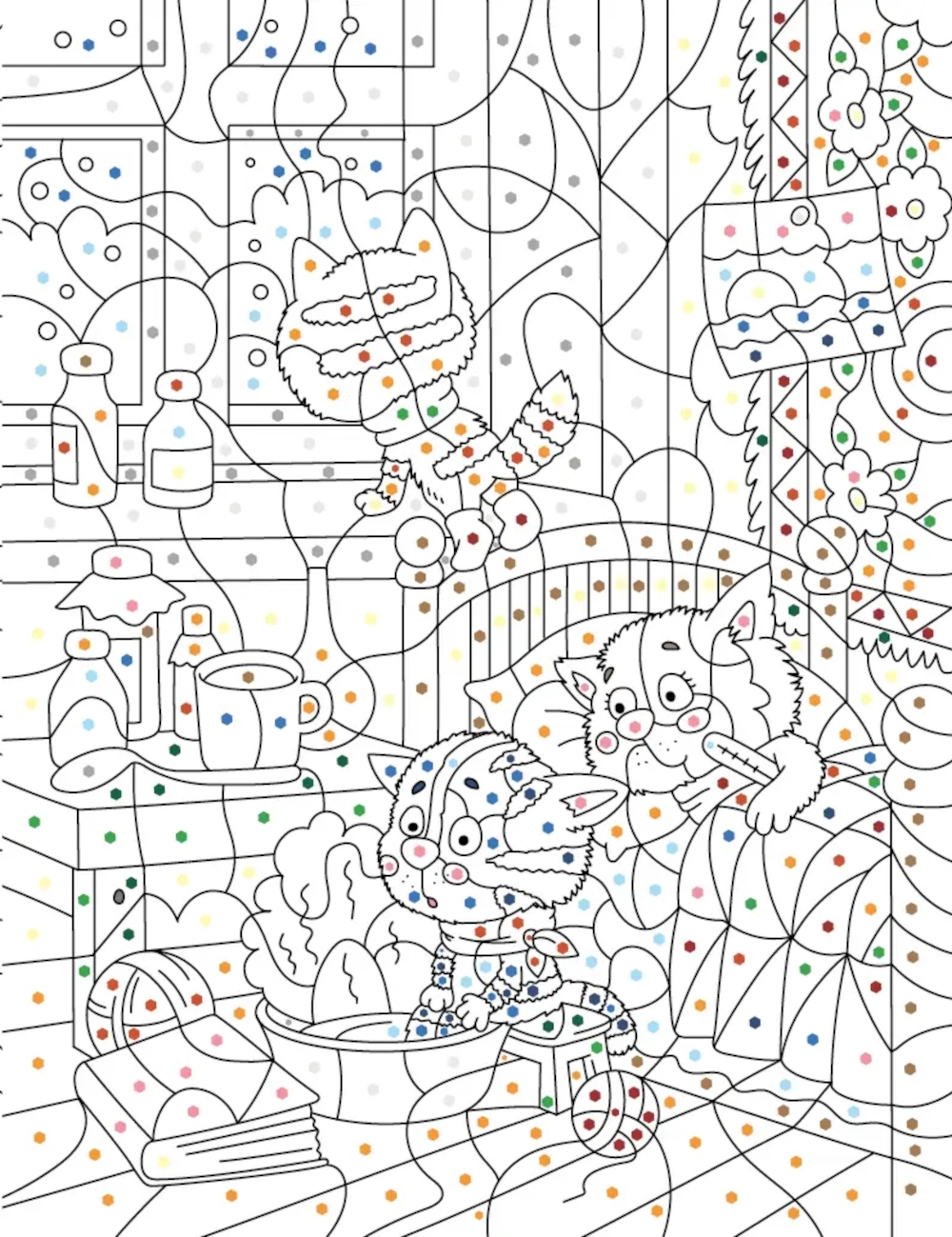 За синими котами Рины Зенюк следят во всём мире! А котята Федя, Вася и Тося стали настоящими любимцами: каждый день они находят новые приключения, к которым уж очень хочется присоединиться! Поэтому предлагаем окунуться в творческий процесс с любимыми персонажами. Перед вами увлекательные раскраски по номерам, цветам, символам. Запаситесь цветными карандашами и любопытством! Выполнив задание на каждой странице, у вас получится забавный сюжет. Отличный вариант для совместного досуга с детьми!| Издательство | Детская литература |