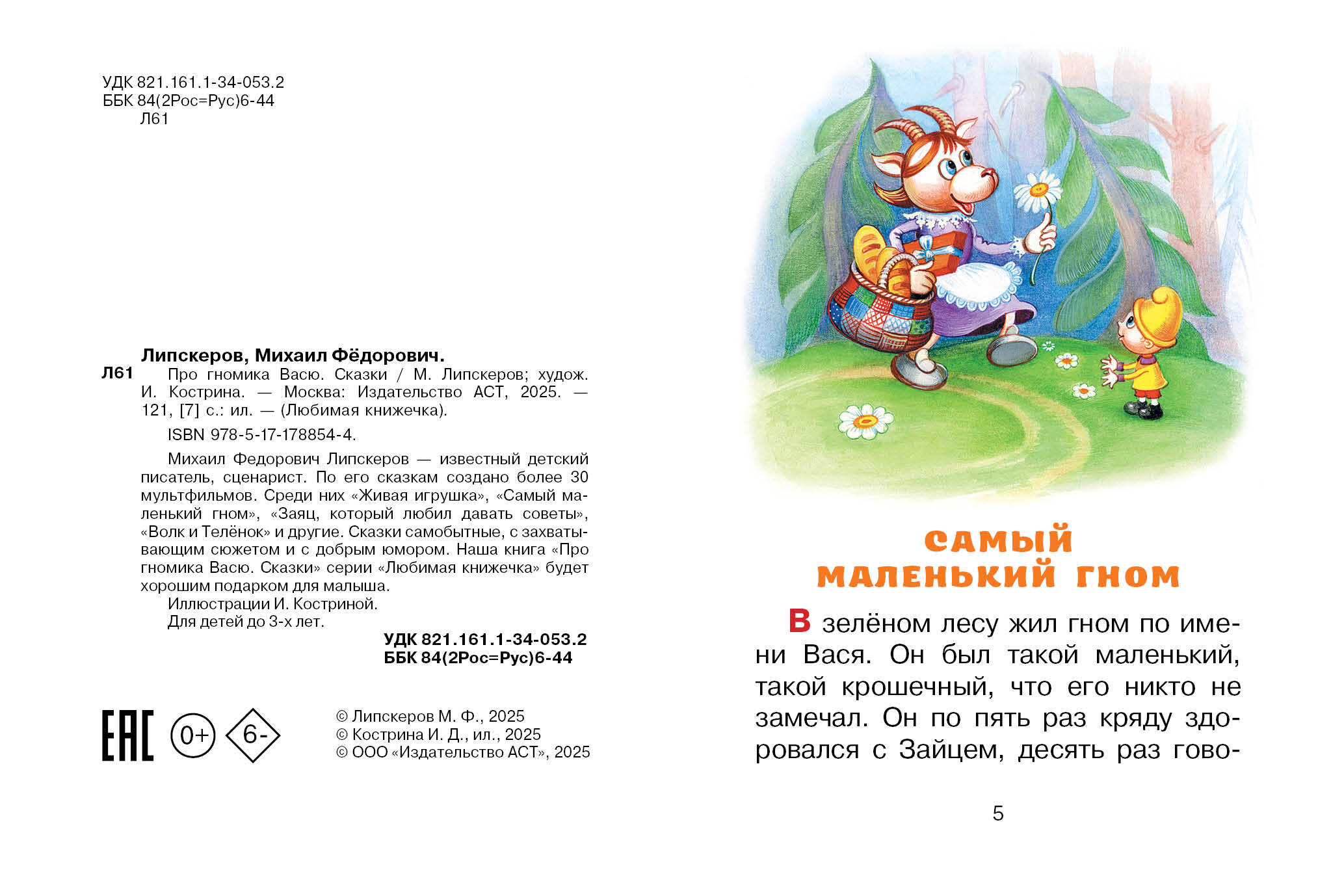 Гномик Вася был таким маленьким, что его никто не замечал. Тогда его дедушка посоветовал ему делать только хорошие дела. Совет пришёлся Васе по душе. Надо сказать, что гном был очень смышлёным. И это ему в дальнейшем очень пригодилось... Маленькие читатели познакомятся и с другими сказочными героями. С Зайчонком, который стал для маленькой девочки живой игрушкой; с Зайцем-зазнайкой, любившим давать советы; с Волком, который неожиданно для себя стал мамой для маленького Телёнка...| Издательство | Издательство "АСТ" |