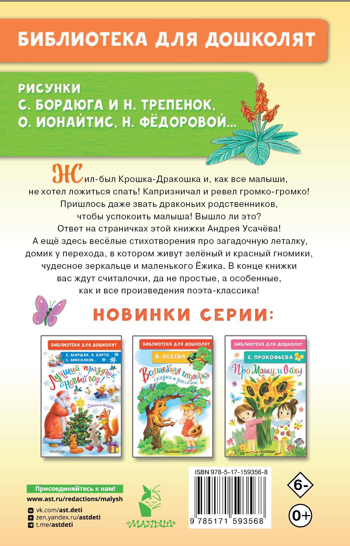 Ж ил-был Крошка-Дракошка и, как все малыши, не хотел ложиться спать! Капризничал и ревел громко-громко! Пришлось даже звать драконьих родственников, чтобы успокоить малыша! Вышло ли это? Ответ на страничках этой книжки Андрея Усачёва! А ещё здесь весёлые стихотворения про загадочную леталку, домик у перехода, в котором живут зелёный и красный гномики, чудесное зеркальце и маленького Ёжика. В конце книжки вас ждут считалочки, да не простые, а особенные, как и все произведения поэта-классика!