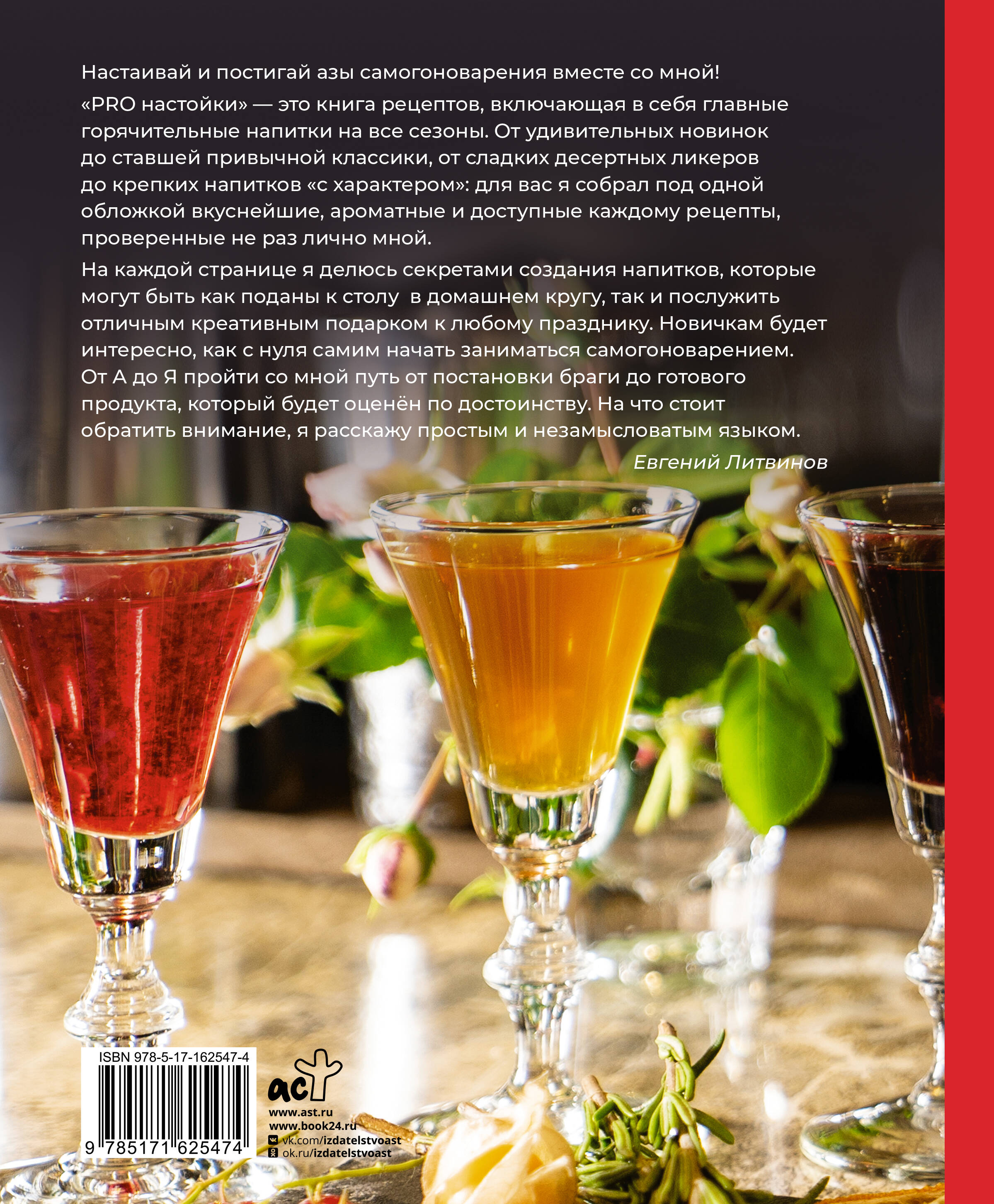 Настаивай и постигай азы самогоноварения вместе со мной! "PRO настойки" - это книга рецептов, включающая в себя главные горячительные напитки на все сезоны. От удивительных новинок до ставшей привычной классики, от сладких десертных ликеров до крепких напитков «с характером»: для вас я собрал под одной обложкой самые вкуснейшие, ароматные и доступные каждому рецепты, проверенные не раз лично мной. На каждой странице я делюсь секретами создания напитков, которые могут быть как поданы к столу в домашнем кругу, так и послужить отличным креативным подарком к любому празднику.| Издательство | Издательство "АСТ" |