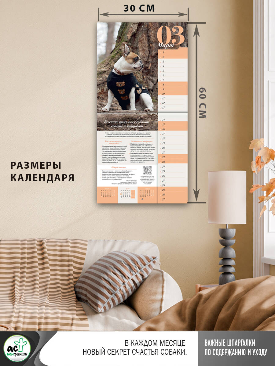 Настенный календарь на 2025 год для владельцев собак с советами от экспертов. • Сезонные особенности организации прогулок от автора бестселлера "Идем ГУЛаЯТЬ. Нескучные прогулки для питомцев и их хозяев" - Татьяны Шамановой. • Рекомендации по играм и развлечениям от известного тренера по бытовому послушанию и трюковой дрессировке - Татьяны Романовой. • Советы по кормлению от ветеринарного врача-диетолога Екатерины Ниговой. Кроме того, в календаре предусмотрено место для записей и напоминаний о важных событиях в жизни вашей собаки.| Издательство | Издательство "АСТ" |