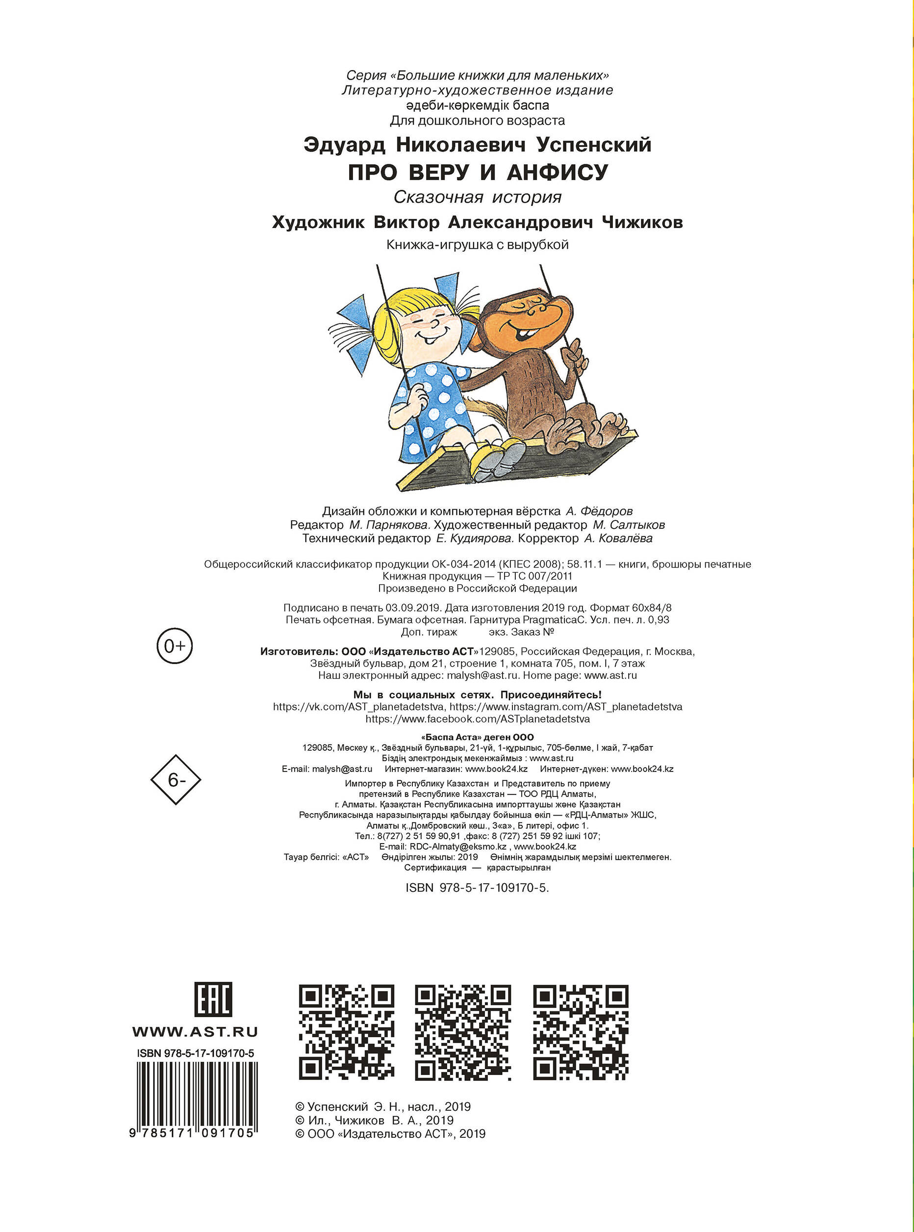 Девочка Вера и обезьянка Анфиса - лучшие подружки! А вы знаете, как Вера и Анфиса познакомились? Как подружились? Прочитайте книжку Э. Успенского "Про Веру и Анфису" и вы узнаете, как забавная обезьянка попала в дом к неменее забавной девочке Вере и её родителям. Картинки в книжке нарисованы знаменитым В. Чижиковым. Для дошкольного возраста.| Издательство | ИЗДАТЕЛЬСТВО "АСТ" |