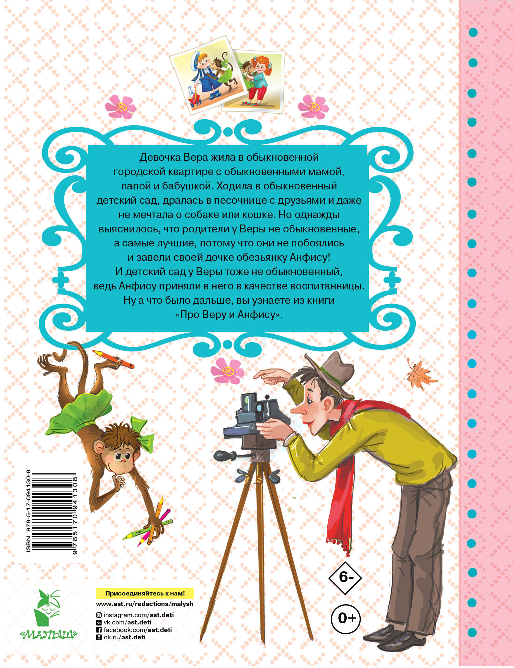 Истории про девочку Веру и обезьянку Анфису знают и любят читатели Эдуарда Успен- ского. По ним были сняты мультфильмы, а песню "Вера и Анфиса" поют и дети, и взрослые. Необычайная популярность этой повести объясняется просто: наверное, нет ни одного челове- ка на свете, который в детстве не хотел бы дружить с умной и весёлой обезьянкой. Для дошкольного возраста.| Издательство | Издательство "АСТ" |