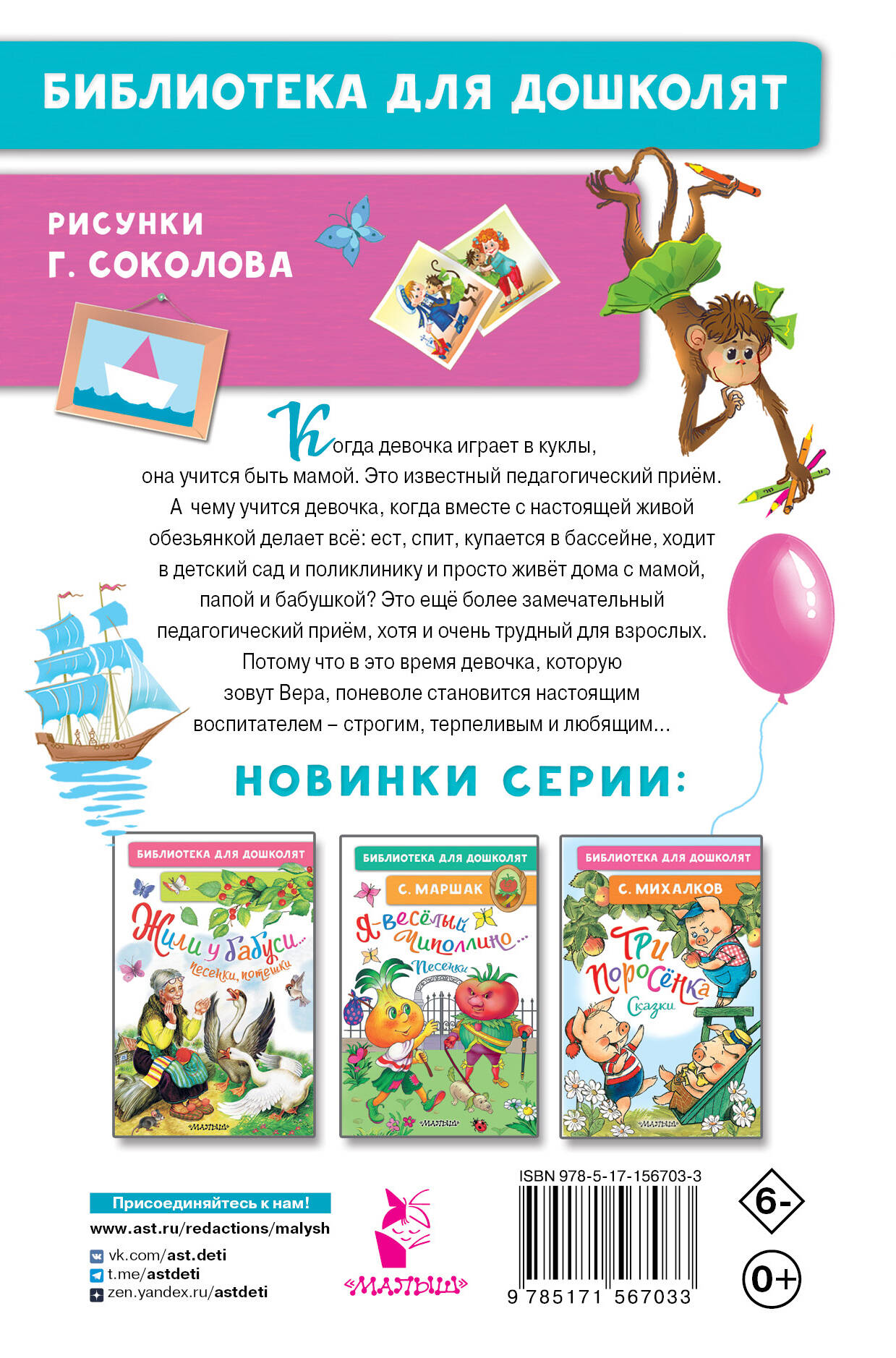 Когда девочка играет в куклы, она учится быть мамой. Это известный педагогический приём. А чему учится девочка, когда вместе с настоящей живой обезьянкой делает всё: ест, спит, купается в бассейне, ходит в детский сад и поликлинику и просто живёт дома с мамой, папой и бабушкой? Это ещё более замечательный педагогический приём, хотя и очень трудный для взрослых. Потому что в это время девочка, которую зовут Вера, поневоле становится настоящим воспитателем - строгим, терпеливым и любящим…| Издательство | ИЗДАТЕЛЬСТВО "АСТ" |
