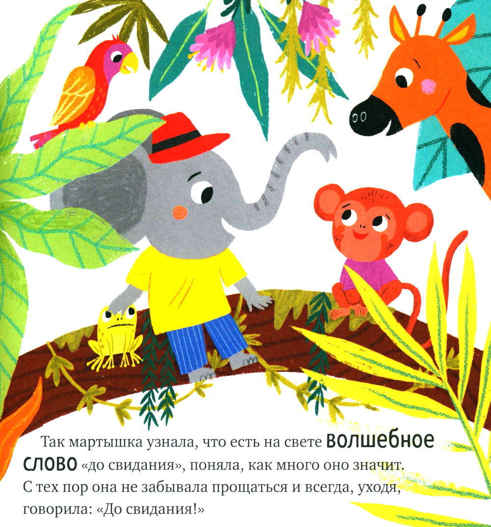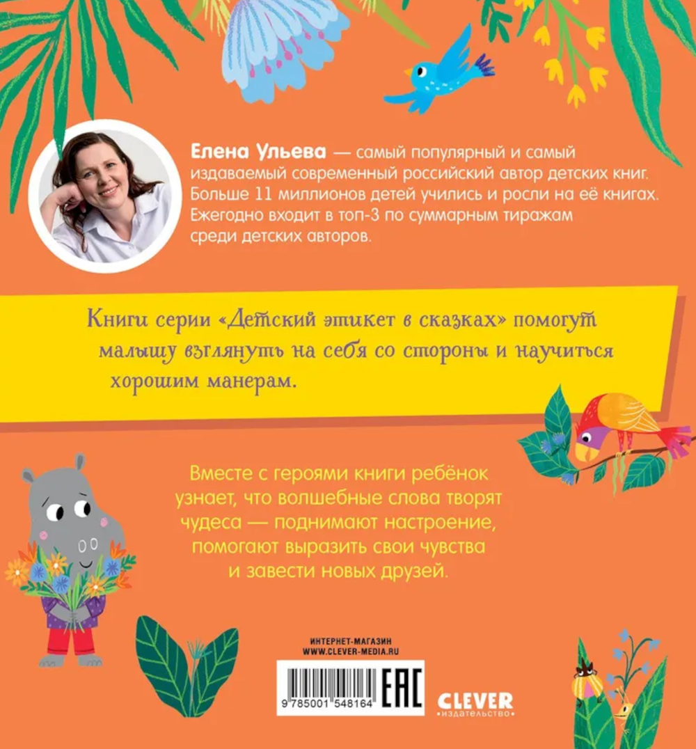 Сборник добрых познавательных сказок «Про волшебные слова» популярного детского автора Елены Ульевой познакомит маленьких читателей с этикетом. Милые герои, простые, понятные истории помогут малышам познакомиться с вежливостью и волшебными словами. Почему друзья и близкие потеряли мартышку и волновались за нее, когда она ушла, не сказав «до свидания»? Как слово «здравствуйте» помогло бегемотику завести друзей? Эта книжка с яркими иллюстрациями научит мальчиков и девочек хорошим манерам, поможет стать внимательными к окружающим и откроет секрет: волшебные слова творят чудеса, они могут помочь выразить чувства и поднять настроение. Книжка с красочными картинками в твердой обложке понравится малышам 2, 3, 4 лет и может стать для них отличным подарком на день рождения (ДР), Новый год (НГ) или на праздник в детском саду. Подарите познавательную книгу Елены Ульевой сыну и дочке, внуку и внучке отдельно или в качестве дополнения к праздничному набору или подарочному комплекту лучших детских книг для мальчиков и девочек.| Издательство | Клевер-Медиа-Групп |