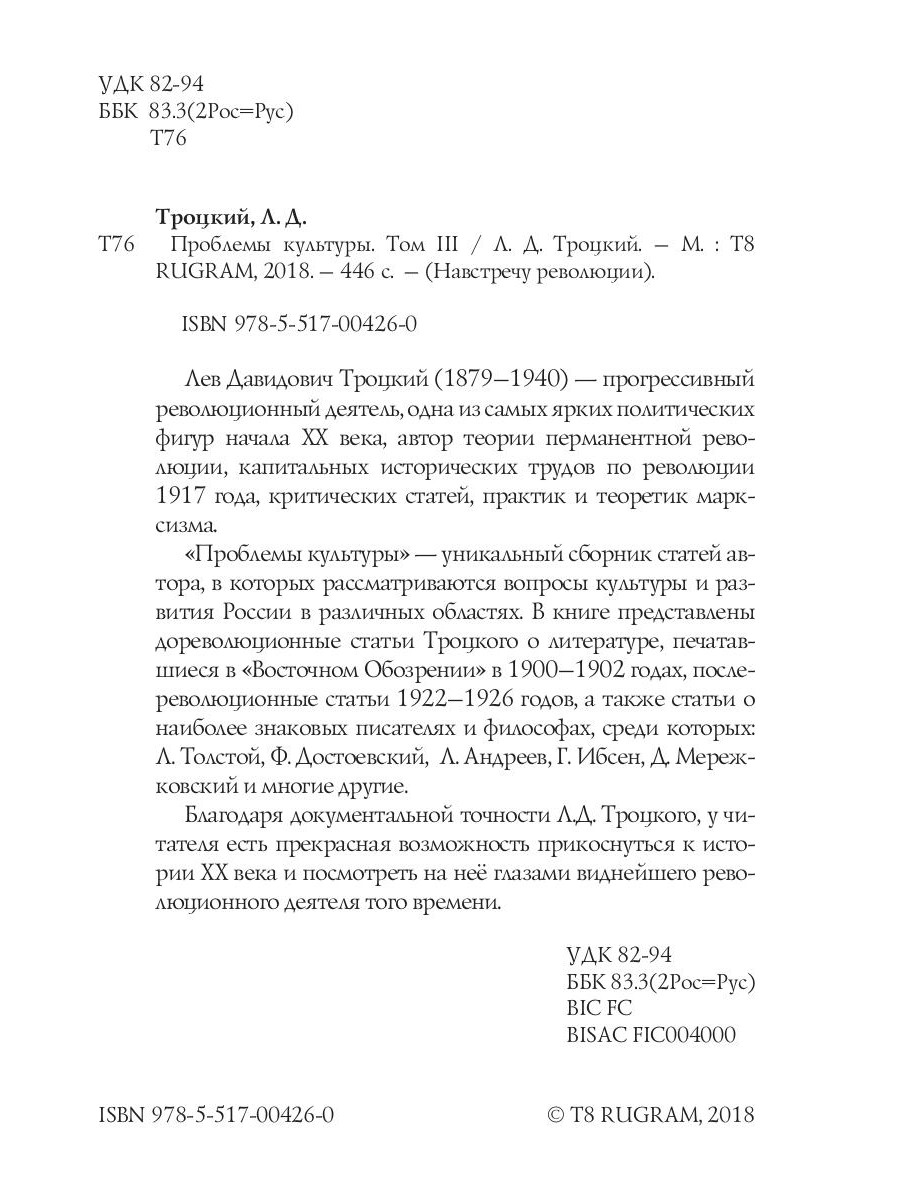«Проблемы культуры» - уникальный сборник статей автора, в которых рассматриваются вопросы культуры и развития России в различных областях. В книге представлены дореволюционные статьи Троцкого о литературе, печатавшиеся в «Восточном Обозрении» в 1900-1902 годах, послереволюционные статьи 1922-1926 годов, а также статьи о наиболее знаковых писателях и философах, среди которых: Л. Толстой, Ф. Достоевский, Л. Андреев, Г. Ибсен, Д. Мережковский и многие другие.