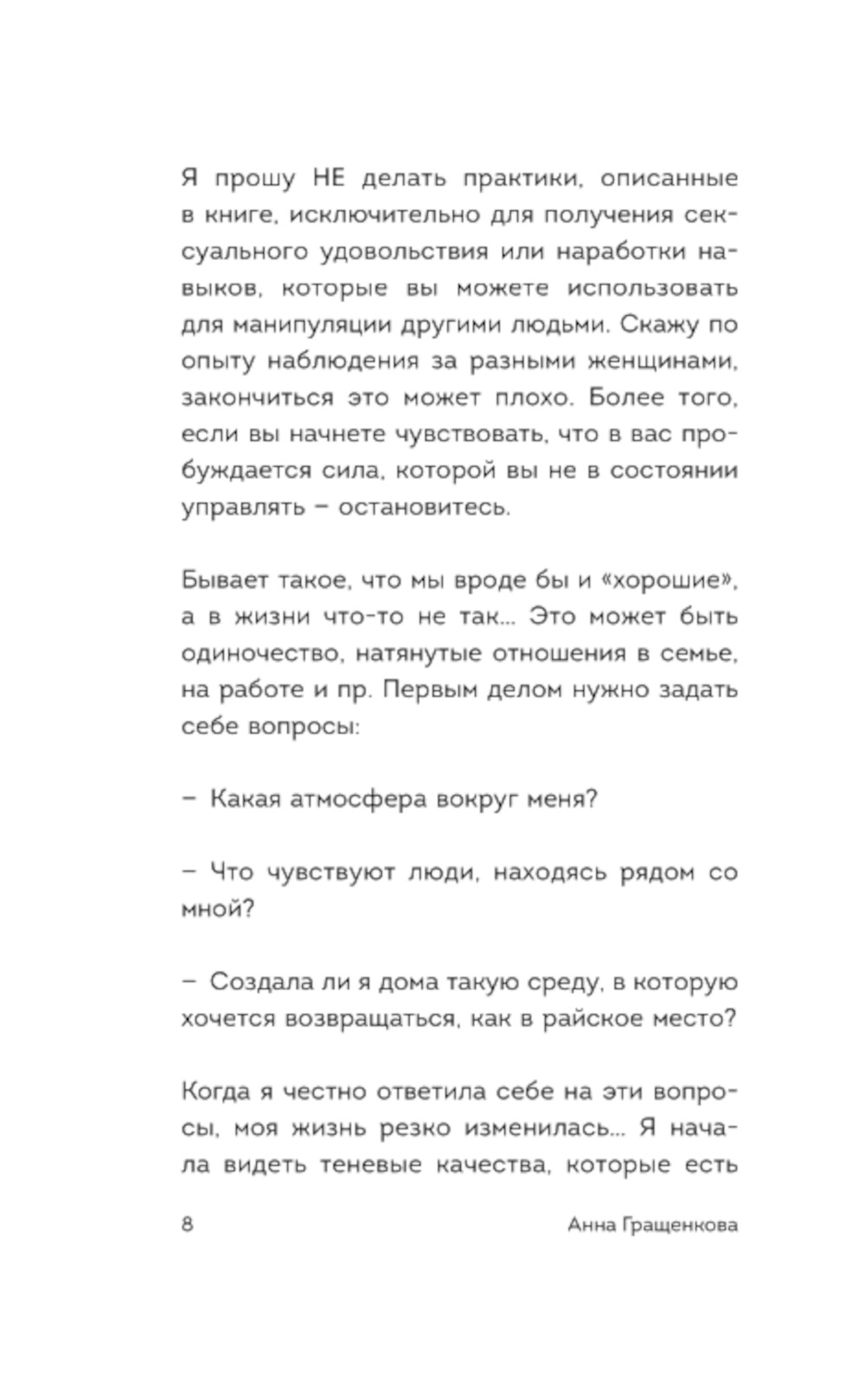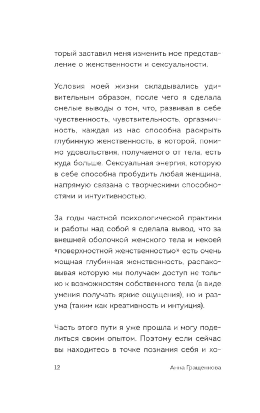 Перед вам обновленное и дополненное издание книги психолога Анны Гращенковой, посвященной техникам и медитациям, раскрывающим женскую сексуальность. Вы научитесь включать и усиливать сексуальное возбуждение, познаете и примете истинную себя и сможете привлечь и удержать в своей жизни любого мужчину. Кроме этого, автор предлагает авторскую методику по тренировке интимных мышц. С помощью этой книги вы: - Поймете, как женственность связана с интуицией и творческими способностями. - Избавитесь от бессознательных блоков, которые мешают получать удовольствие. - Исследуете свое тело. - Станете желанной и привлечете в свою жизнь все желаемые обстоятельства.