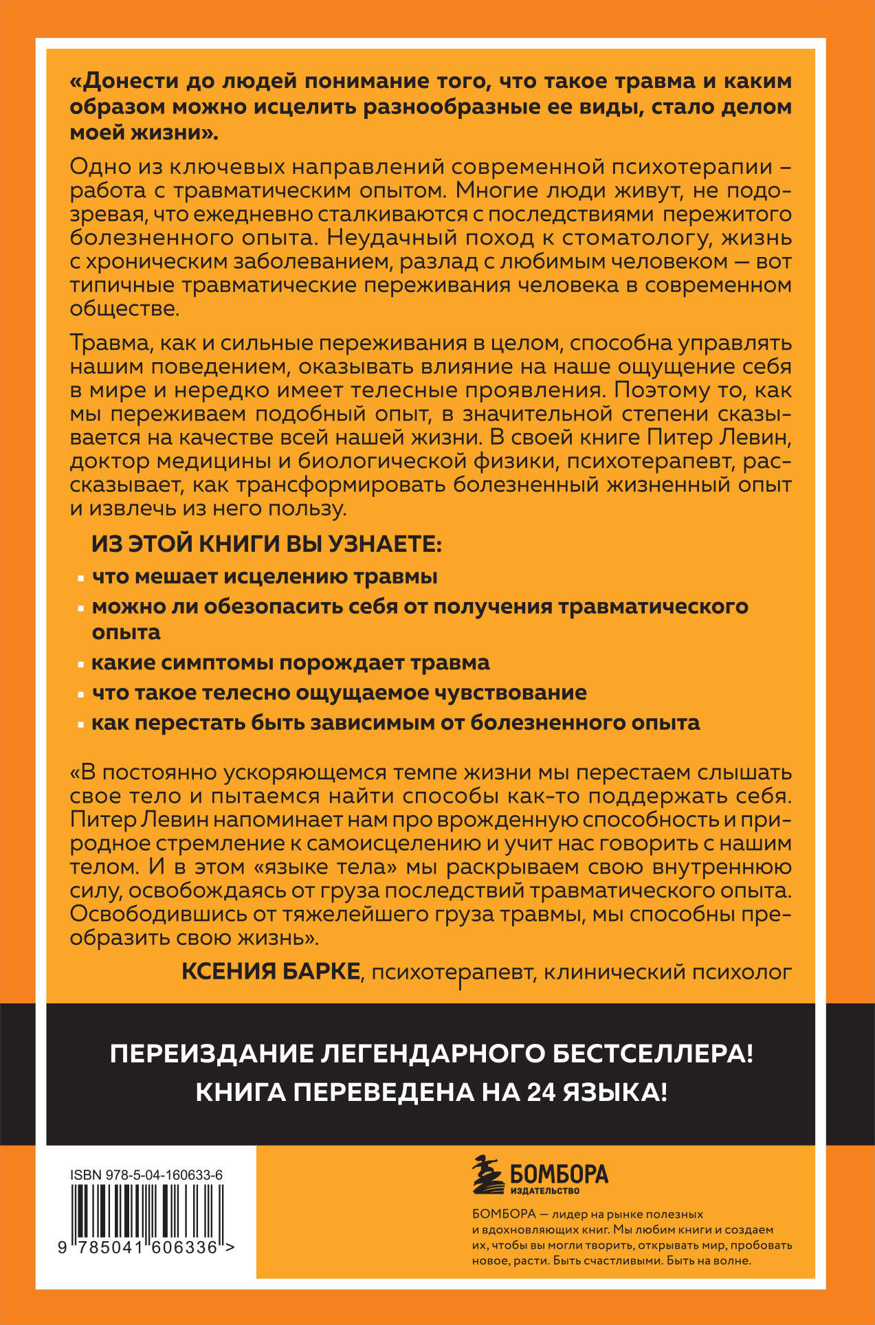 «Донести до людей понимание того, что такое травма, и каким образом можно исцелить разнообразные ее виды, стало делом моей жизни». ПЕРЕИЗДАНИЕ ЛЕГЕНДАРНОГО БЕСТСЕЛЛЕРА О ПСИХОЛОГИЧЕСКОЙ ТРАВМЕ! КНИГА ПЕРЕВЕДЕНА НА 24 ЯЗЫКА! Одно из ключевых направлений современной психотерапии - работа с травматическим опытом. Многие люди живут, не подозревая, что ежедневно сталкиваются с последствиями пережитого болезненного опыта. Неудачный поход к стоматологу, жизнь с хроническим заболеванием, разлад с любимым человеком - вот типичные травматические переживания человека в современном обществе. Травма, как и сильные переживания в целом, способна управлять нашим поведением, оказывать влияние на наше ощущение себя в мире и нередко имеет телесные проявления. Поэтому то, как мы переживаем подобный опыт, в значительной степени сказывается на качестве всей нашей жизни. В своей книге Питер Левин, доктор медицины и биологической физики, рассказывает, как трансформировать болезненный жизненный опыт и извлечь из него пользу. Из этой книги вы узнаете: - что мешает исцелению травмы; - можно ли обезопасить себя от получения травматического опыта; - какие симптомы порождает травма; - что такое телесно-ощущаемое чувствование; - как перестать быть зависимым от болезненного опыта.| Издательство | Эксмо |