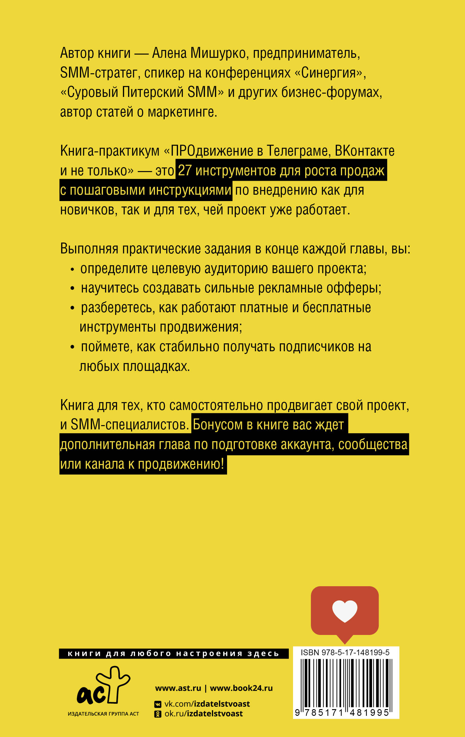 Автор книги - Алена Мишурко, предприниматель, SMM-стратег, спикер на конференциях "Синергия", "Суровый Питерский SMM" и других бизнес-форумах, автор статей о маркетинге. Книга-практикум "ПРОдвижение в Телеграме, ВКонтакте и не только" - это 27 инструментов для роста продаж с пошаговыми инструкциями по внедрению как для новичков, так и для тех, чей проект уже работает. Книга для тех, кто самостоятельно продвигает свой проект, и SMM-специалистов. Бонусом в книге вас ждет дополнительная глава по подготовке аккаунта/сообщества/канала к продвижению! Выполняя практические задания в конце каждой главы, вы: ⁃ Определите целевую аудиторию вашего проекта; ⁃ Научитесь создавать сильные рекламные офферы; ⁃ Разберетесь, как работают платные и бесплатные инструменты продвижения; ⁃ Поймете, как стабильно получать подписчиков на любых площадках.| Издательство | ИЗДАТЕЛЬСТВО "АСТ" |